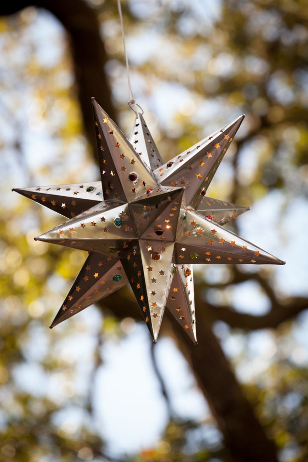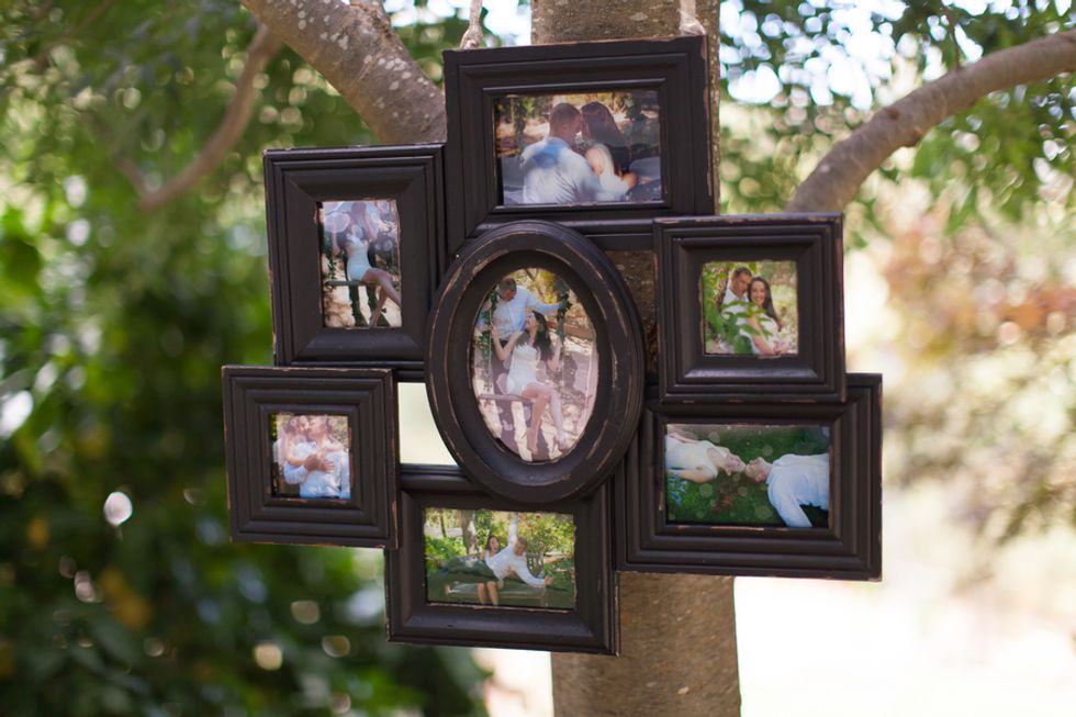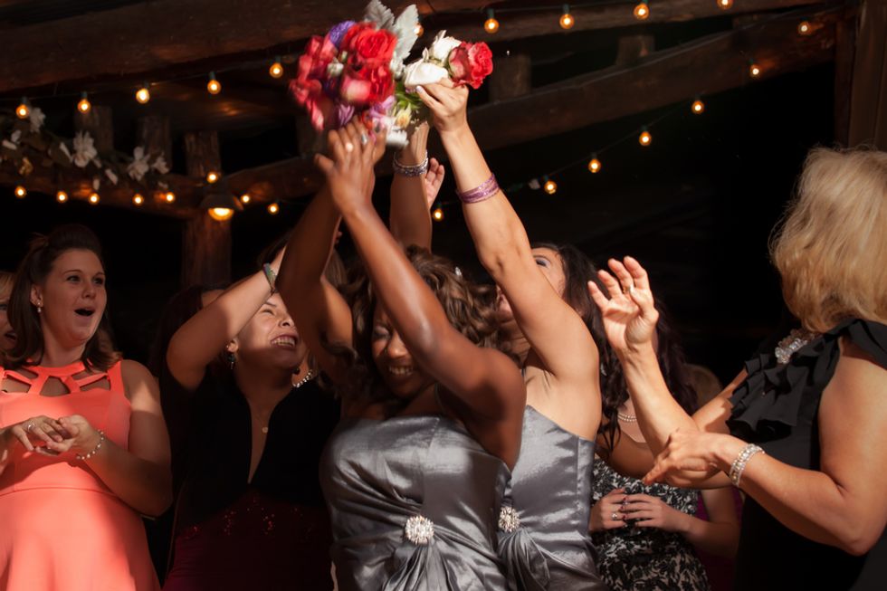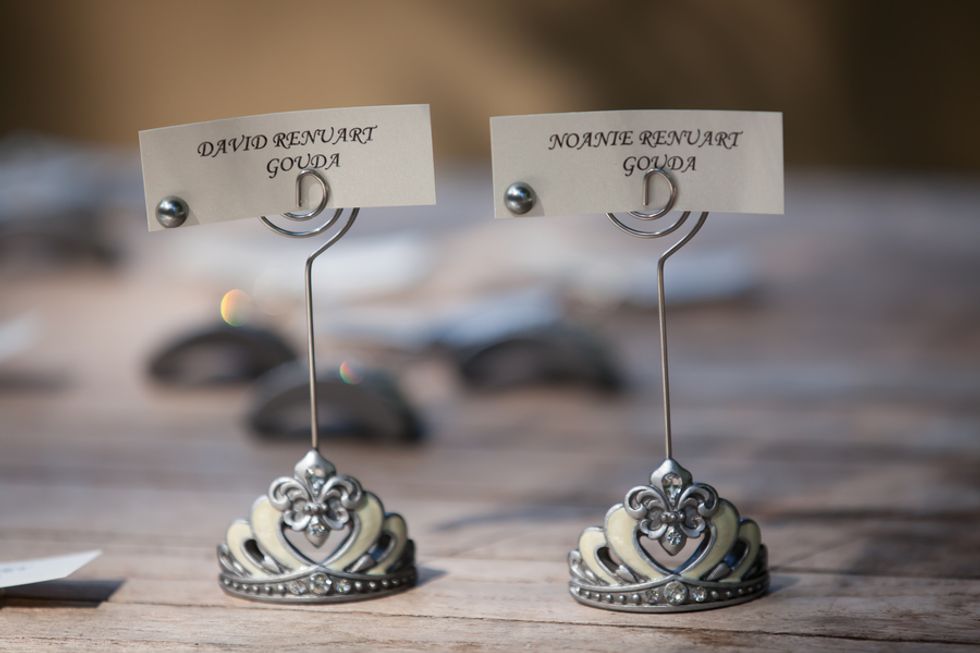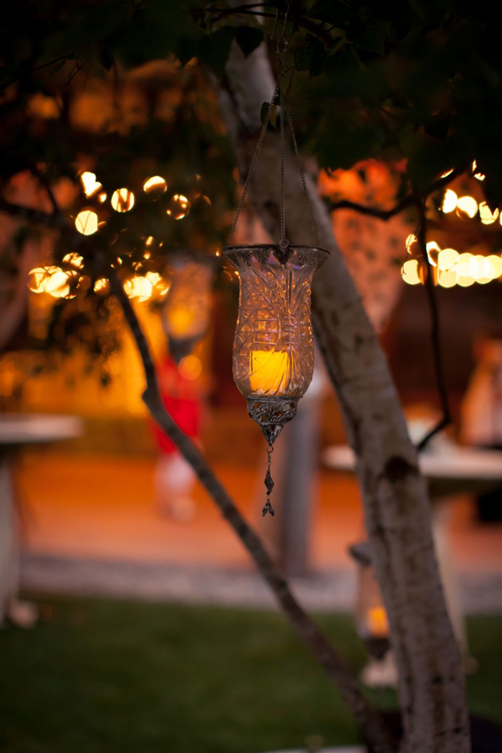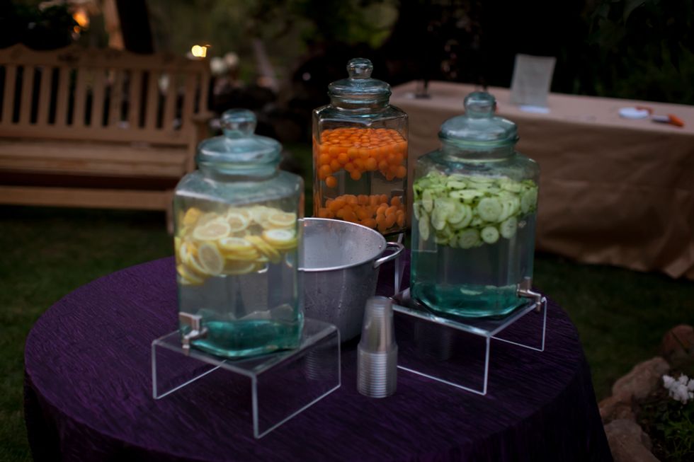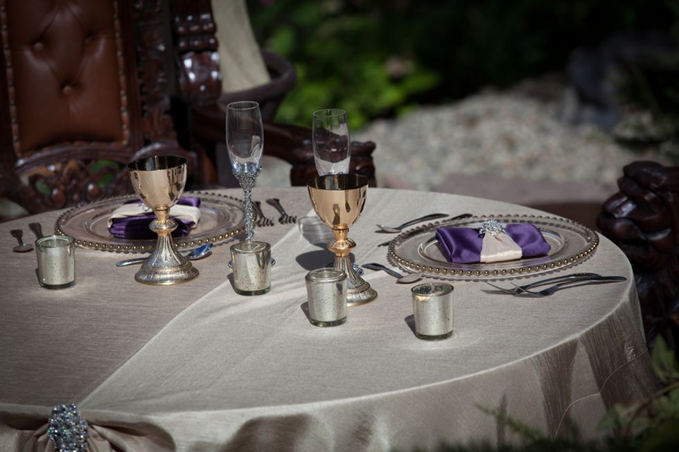 Luckily, Dana's father owns the venue, so the bride had full reign to turn Creekside Terrace in Los Gatos into a mini-Versailles. Spanish stars and chandeliers lit up the Redwoods with a luxurious glow while personalized silverware engraved with promises and golden goblets glittered in the candlelight. Tiara-shaped paperweights kept place markers from flying away. In keeping with the luxe color scheme, the cake was four layers of hand-piped roses, fleurs de lis, and pearls in gold icing that sat underneath a veiled birdcage until it was time.