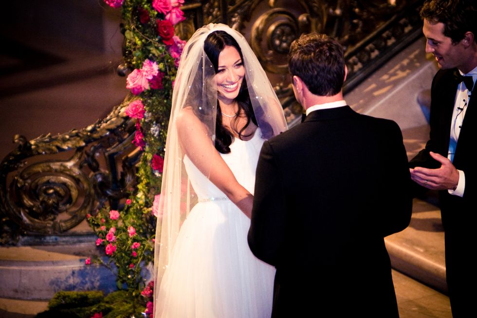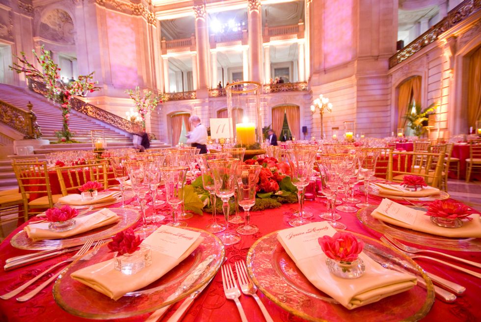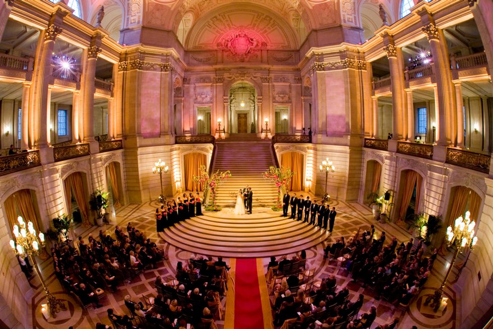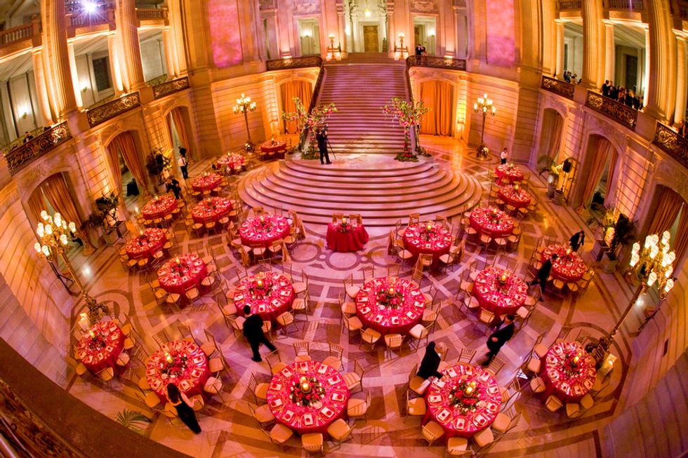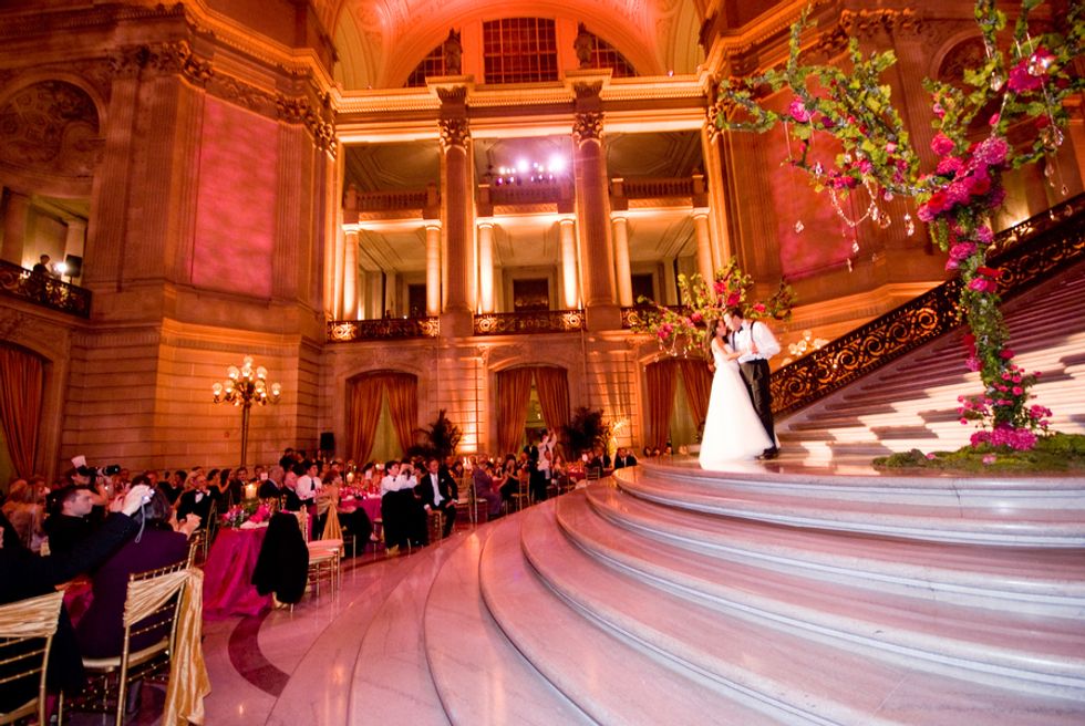 Jessica and Cassidy were married at one of California's most sought-after and elegant venues, San Francisco City Hall. The wedding was inspired by Jessica's dream of an enchanted fairytale with lots of crystals and a pink and gold-toned palette. The arches into the Rotunda were accented with gold silk drapes and chiavari chairs with programs and silk-bagged pieces of Chinese jade, a nod to Jessica's heritage.