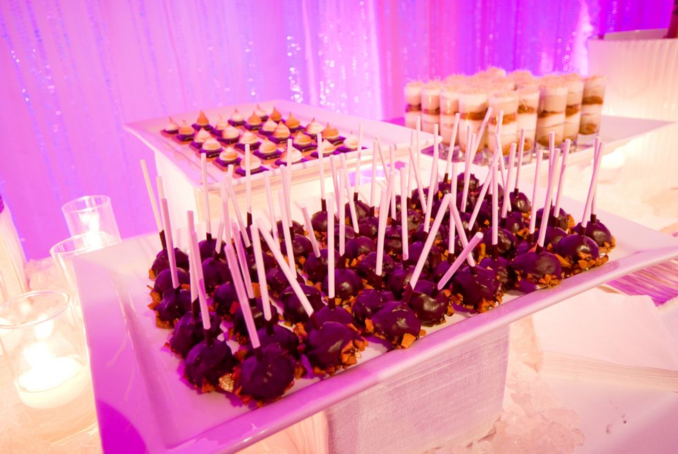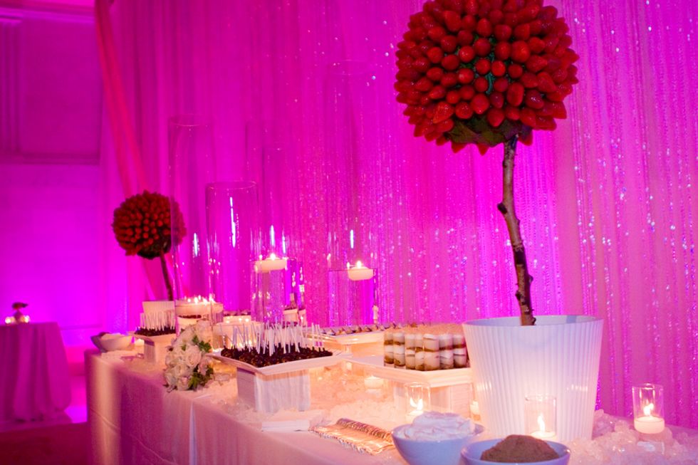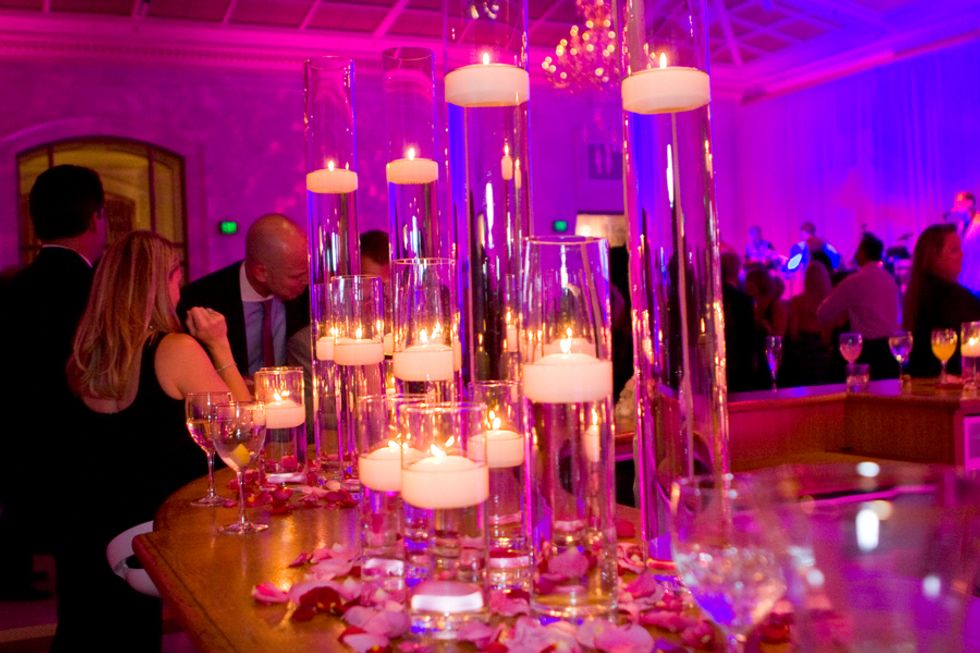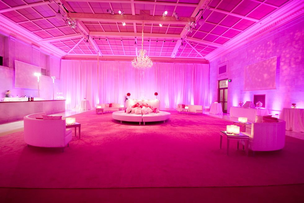 Following the cermeony, the Rotunda was transformed to a dramatic dining environment with fuchsia linens and accented with antique gold candled centerpieces and pink roses, mosses and a sprinkling of oversized crystals. After dinner, guests followed the couple into the adjacent North Light Court with tall crystal columns, chandeliers, a hip pink lounge, and dessert buffet. Jessica's dad sang a special song to the couple while silk flower petals fell from the ceiling - the perfect ending to a magical day.