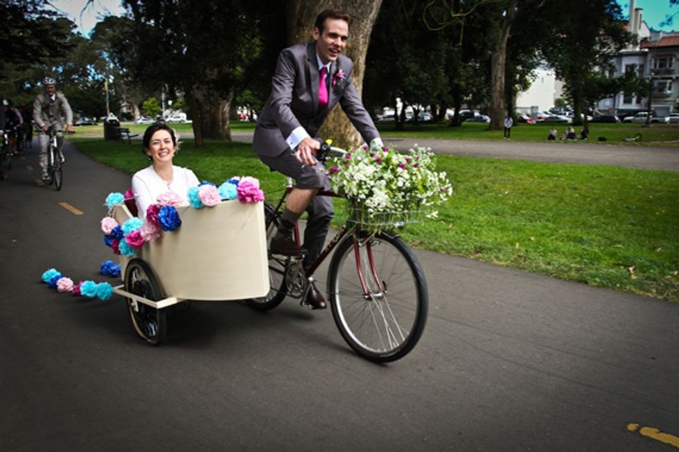 The couple decided to borrow a friend’s Panhandle flat as a place to get dressed for the ceremony. From there, they planned ride a tandem bicycle (with their friends peddling along behind on their own bikes) to the site. But, fashion intervened. “I really wanted to wear a long gown, and you can’t ride a bike wearing that,” says Alison, who wore a dress by local designer Amy Kuschel along with her signature Tigers. Luckily Nathan’s father, who lives in Atlanta and is described as the “ultimate maker,” came up with the idea to create a sidecar for his son’s vintage Heron touring bike. He started the project in Nathan’s hometown of Atlanta, shipped it to S.F., and finished it off with products ordered from Cole Hardware.