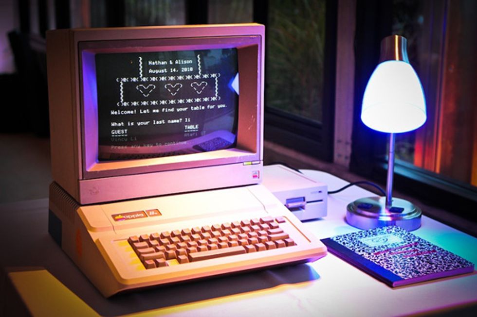 Then guests sat down to a classic Georgia feast (pork loin, mac and cheese and cornbread created by Fork & Spoon catering) and decor inspired by Nathan’s boyhood home and the Southern Gothic film Big Fish—all mixed with references to computers and Alison’s Japanese heritage. “We decorated the tables with Mason jars filled with plants and little battery-powered lights we rigged to look like fireflies. We also created lighting to look like a starry night sky and strung big market lights,” says Alison. “I bought an old Apple IIe, which is what I had as my first computer, and programmed it to give people their seat assignments. The table cards were old punch cards from vintage computers.” [Read California Home+Design's article about collecting vintage technology here.]