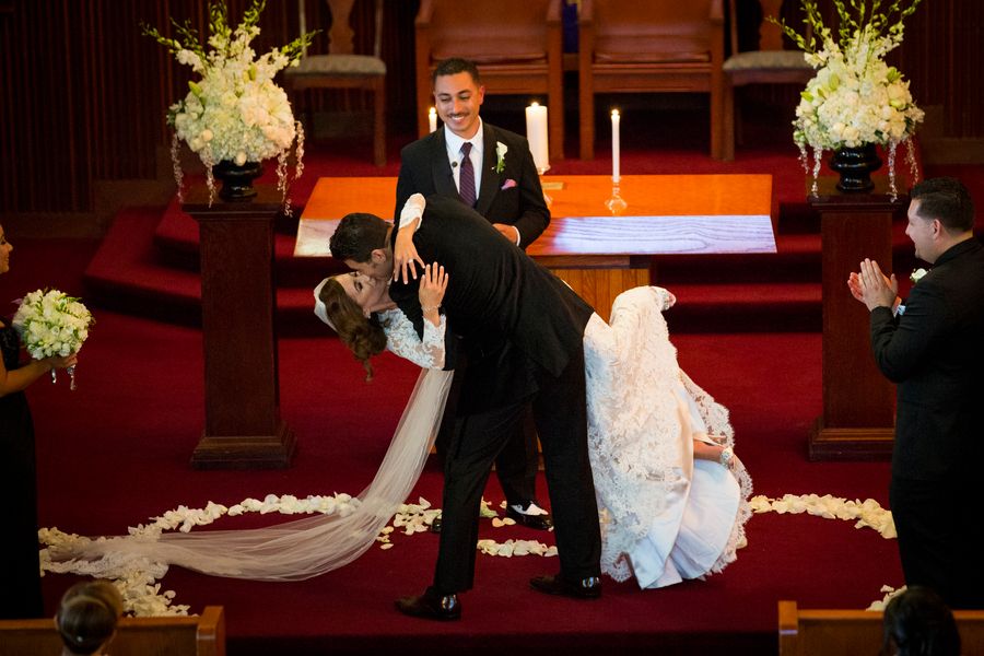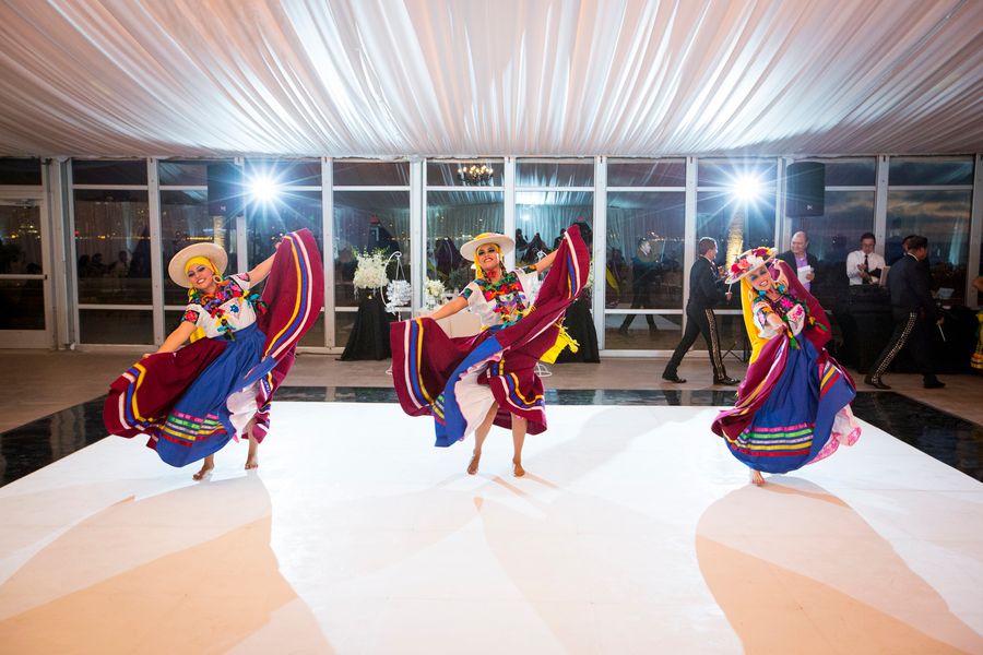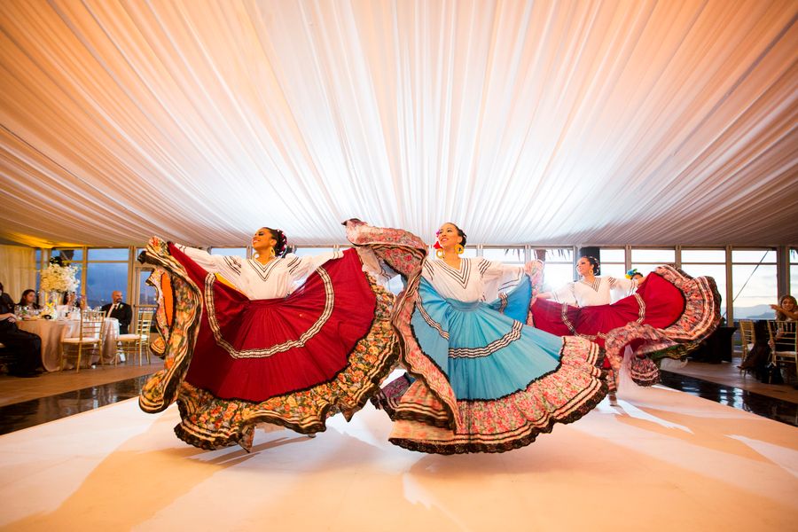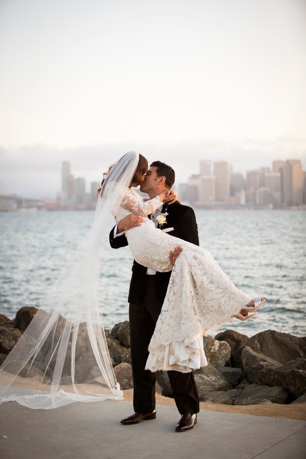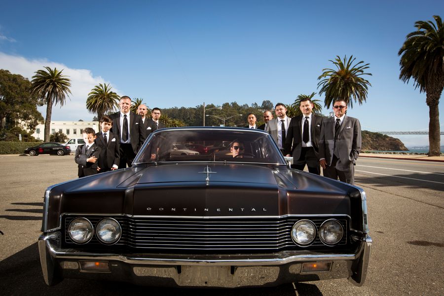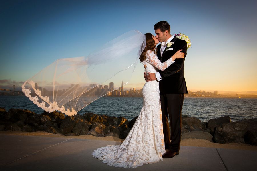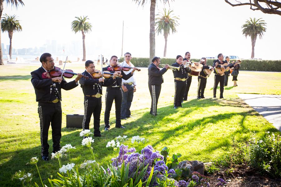 Stephanie and Juan Munoz tied the knot in traditional Mexican-Catholic style in a chapel surrounded by family on SF's Treasure Island. The bride dressed in white lace while the rest of the wedding party donned black. The city skyline made for a picturesque backdrop as the couple posed for their wedding portraits. Complete with a low-rider Lincoln Continental, traditional folk dancers, and a mariachi band, the festivities lasted late into the night.