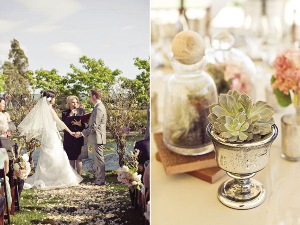 "We wanted to get married in a place that represented us as a couple," says Jessica. "We chose Cornerstone Sonoma because it's fun, different, and a bit kooky—it's not too serious, and neither are we." The bride's bouquet showcased the event's color palette. "I'm drawn to muted, dusky colors," she says. "We chose soft green, pink, orange, and gray-blue." Jessica's vows contained a line from Moulin Rouge, a movie both she and Tim love: "Come what may, I will love you until my dying day."