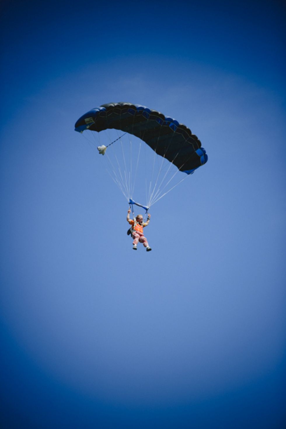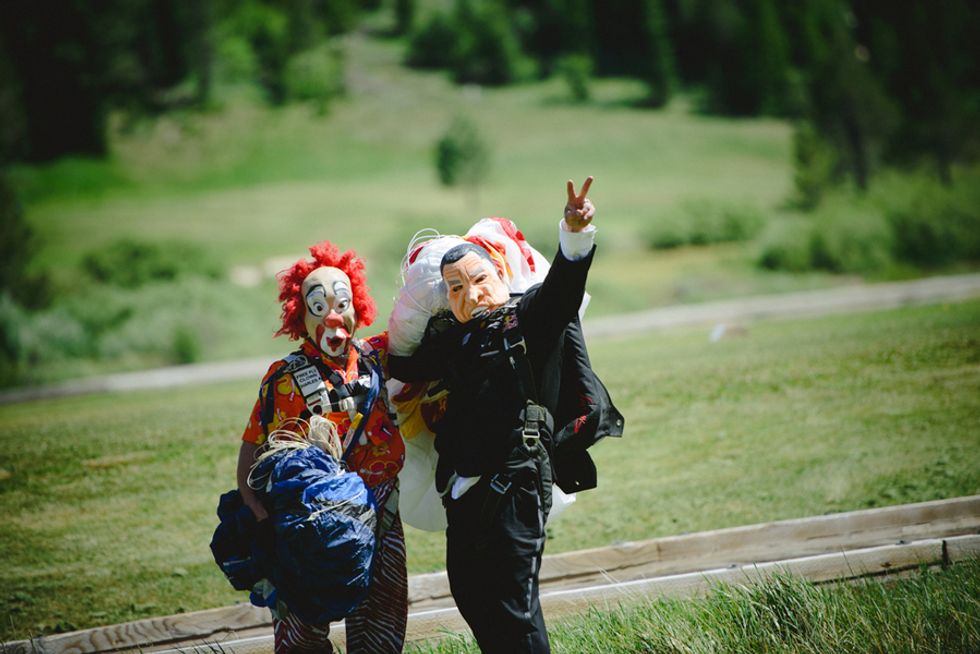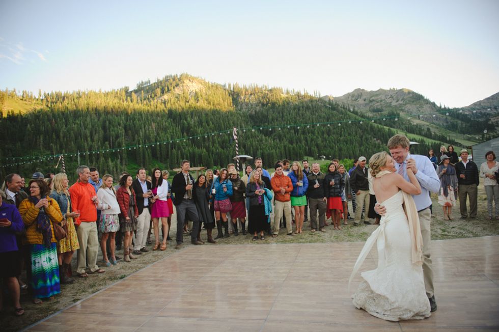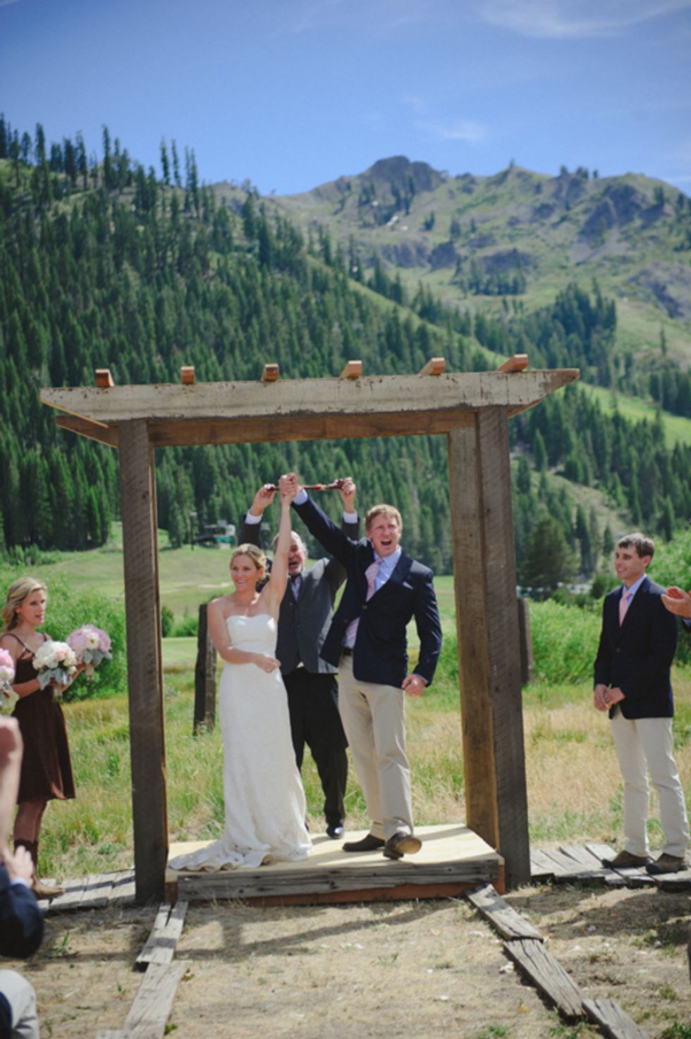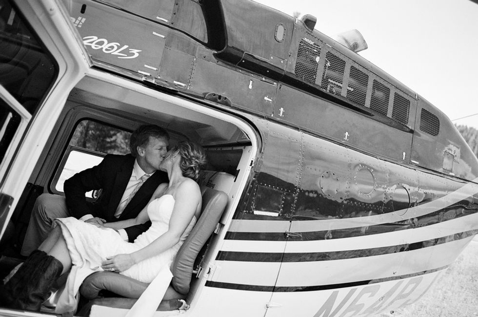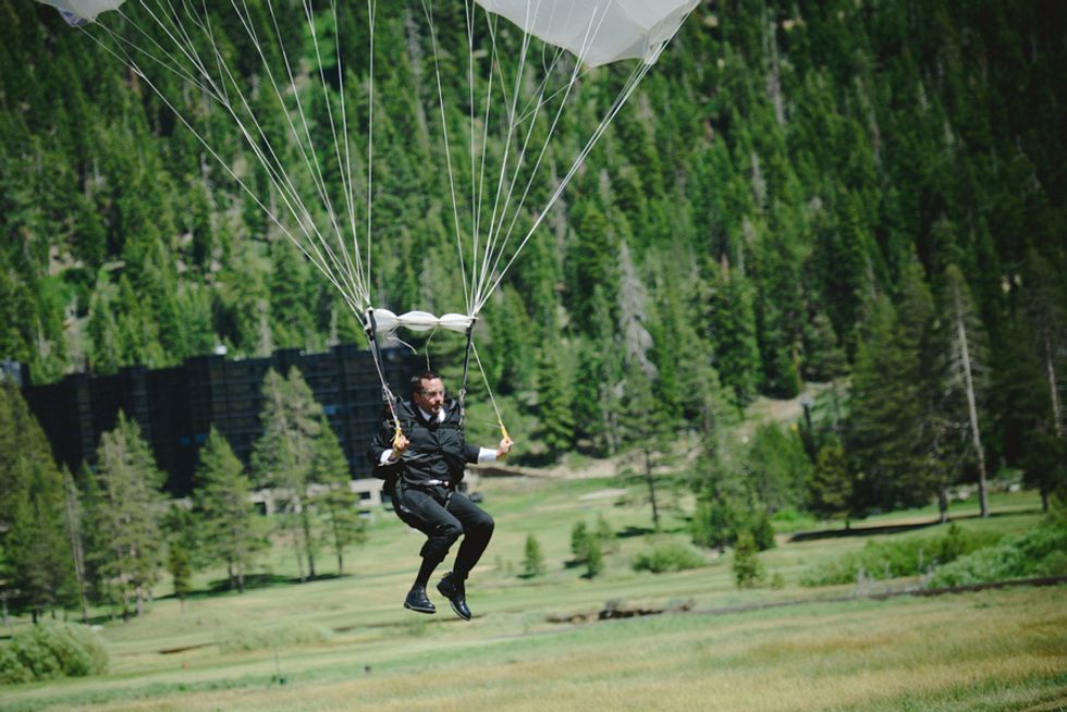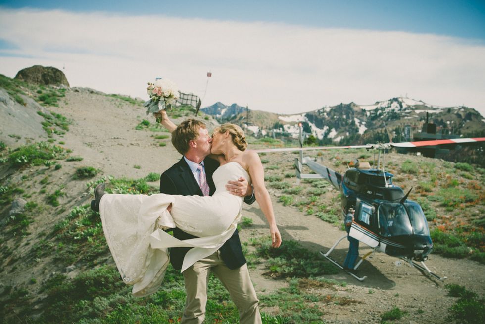 The groom surprised his bride with a quick helicopter ride to the peak of KT 22 on Squaw, where the snowbirds first met. Guests of the wedding parachuted into the ceremony wearing masks of former presidents, a la the movie Point Break.