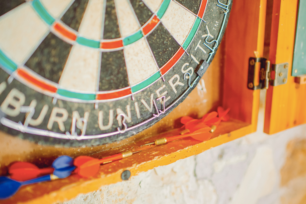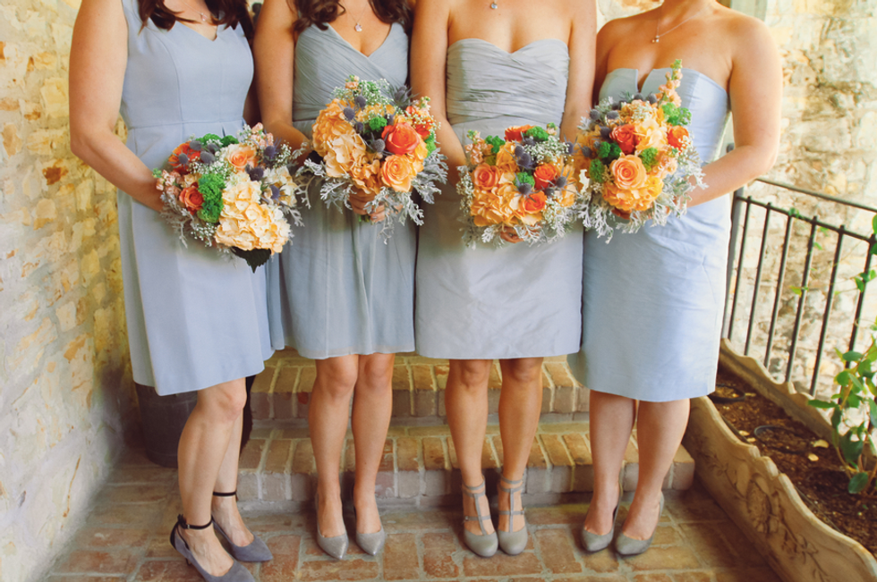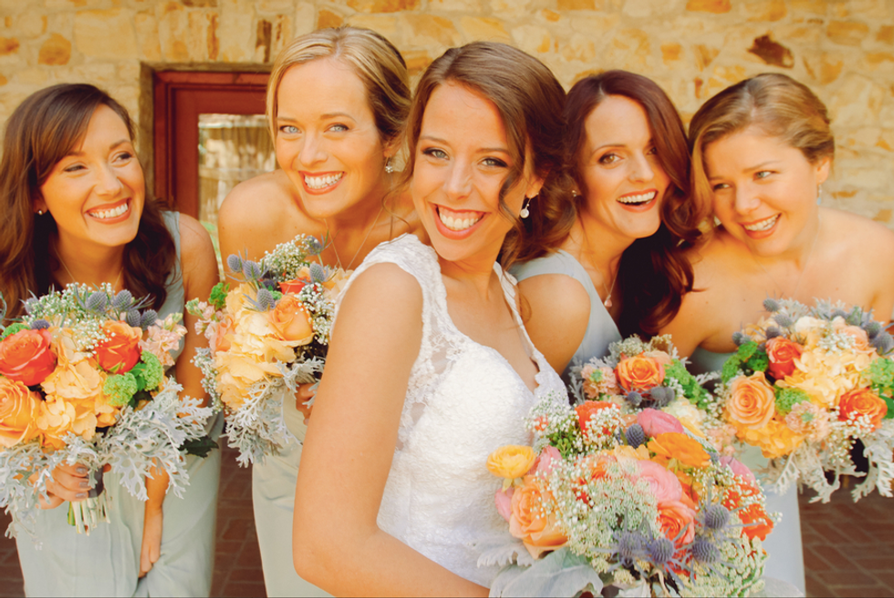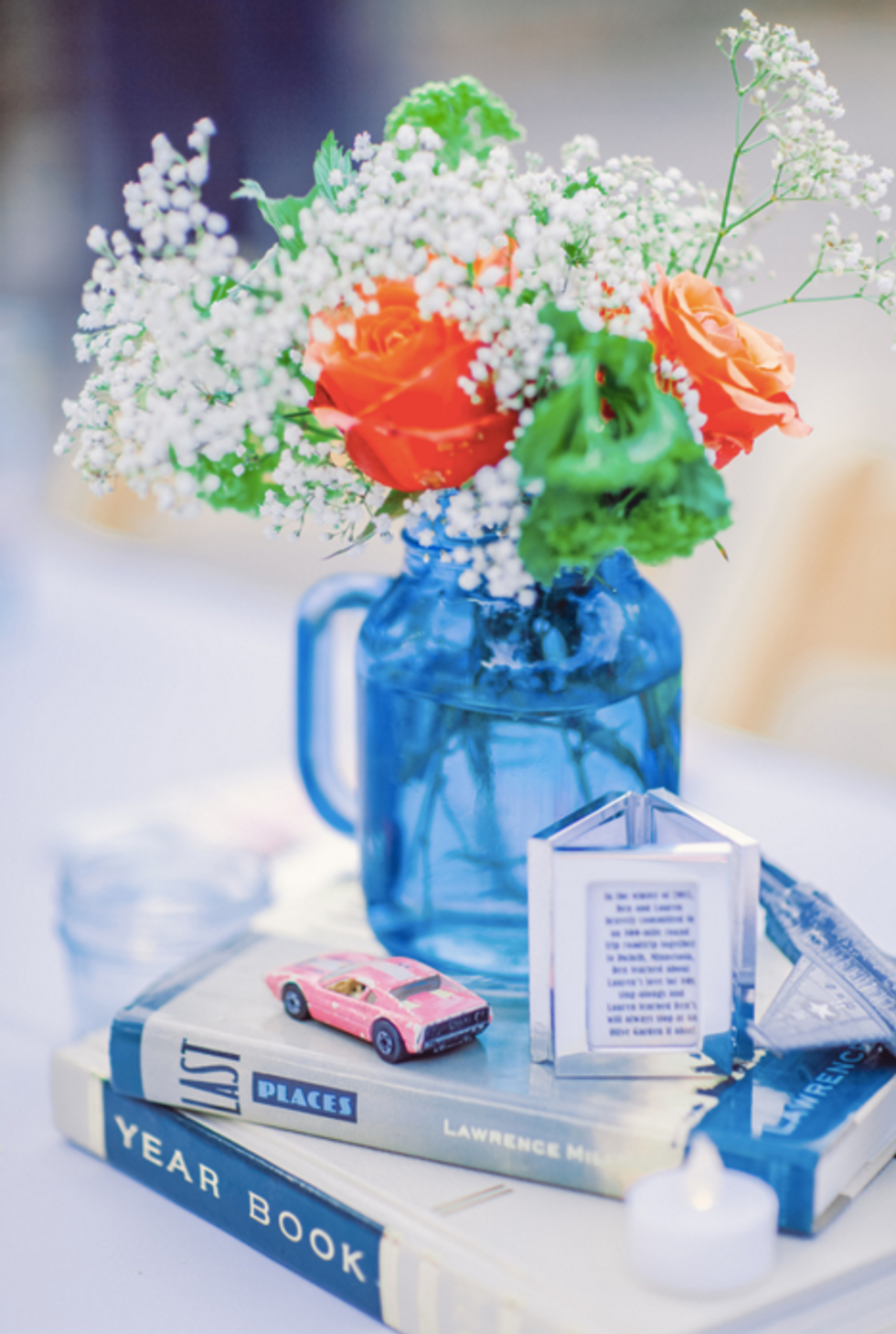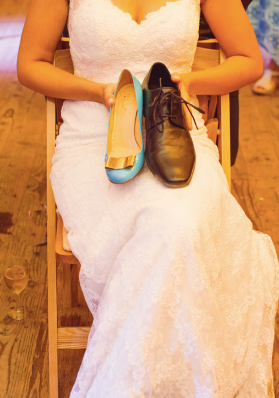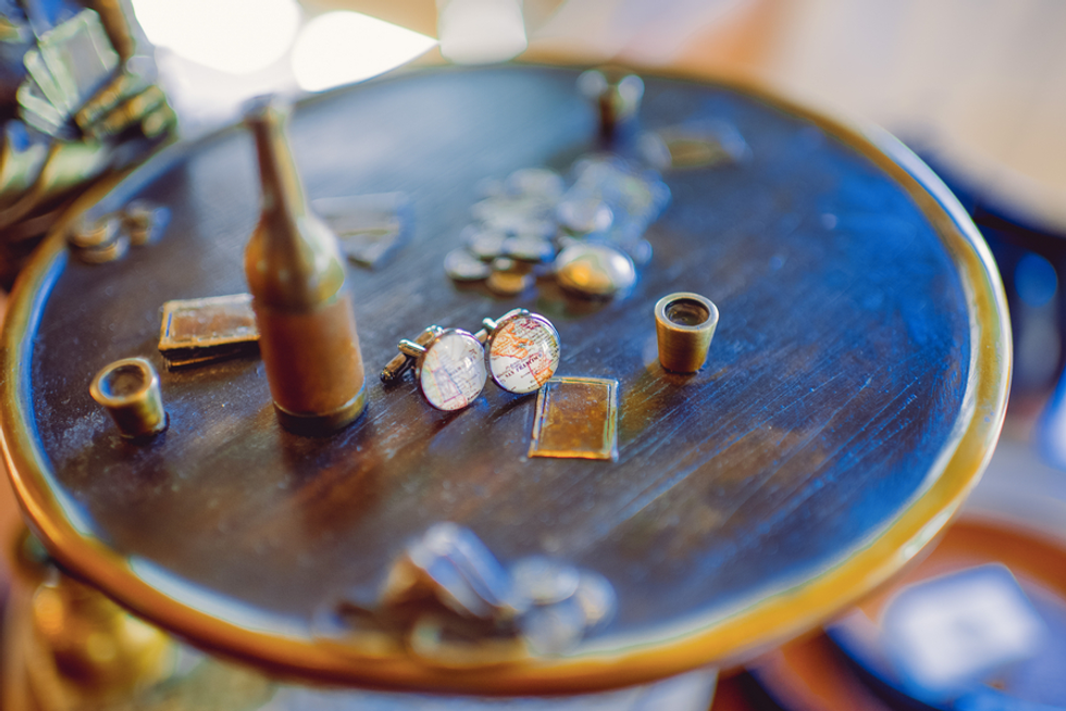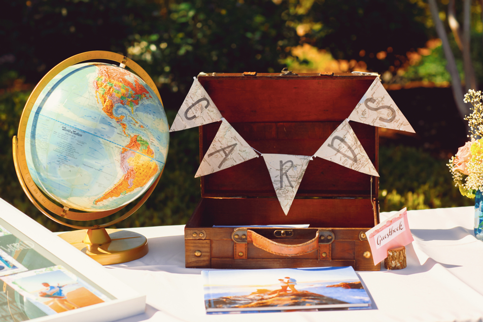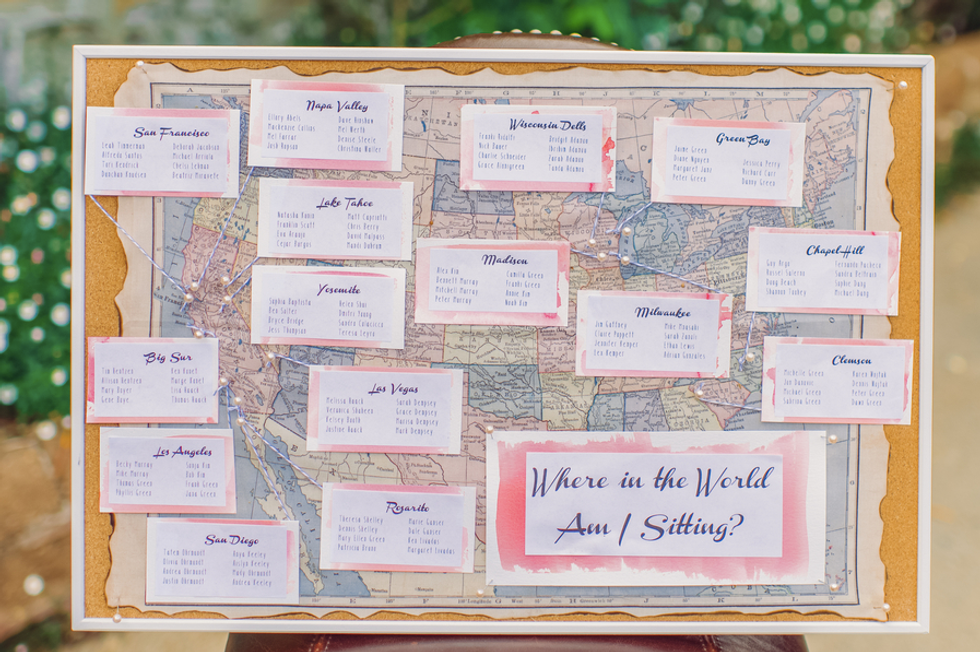 The couple's mutual love of travel and adventure inspired both the wedding invitations and decor, from the groomsmen's cuff links (tiny maps cut outs) to the seating chart (a map of the world). Guests enjoyed lively yard games and coloring books, all of which Lauren and Ben made themsleves. A watercolor palette of blush, peach, coral, and sea spray blue set the color scheme and rustic, vintage touches tied everything together.
