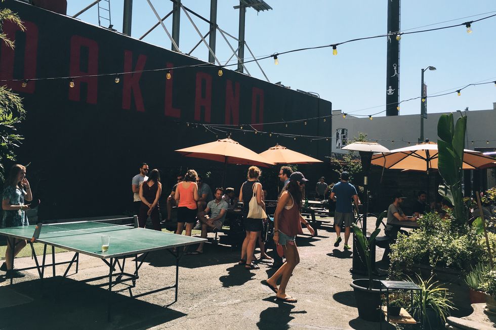 Now that you're all geared up, it's time to hit the Oakland bar crawl trail. Lake Merritt is right across the street from Lakeview Bicycle, so start here and work your way south along the trail. Take in the views of the great blue lake and enjoy the people watching as you bike by. After about a mile, turn off the lake pathway to Portal, which has an awesome outdoor beer garden with huge picnic benches and large yellow umbrellas. // 1611 Second Ave., portaloakland.com
