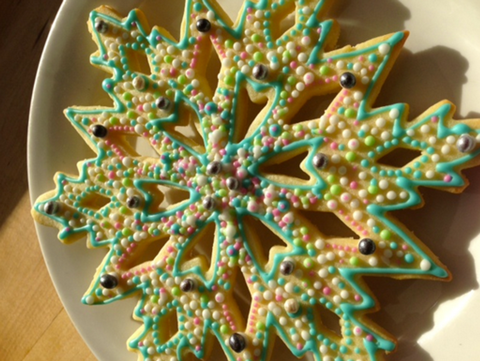 At Pastry Cupboard in Hayes Valley, the prize holiday treats are pastry chef Chona Piumarta's seven-inch shortbread snowflake cookies. Just like real snowflakes, each one is an original. Piumarta takes about 20 minutes per cookie to hand-decorate with royal icing, chocolate "pearls," and more. She plans to make about 150 of the beauties this year, and expects them to fly off the shelves.