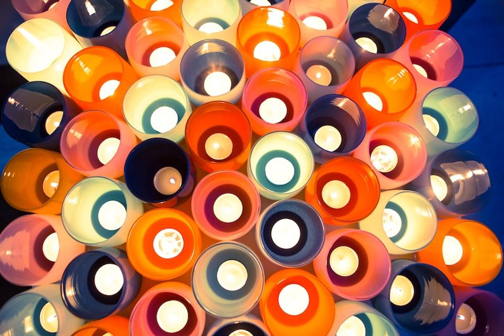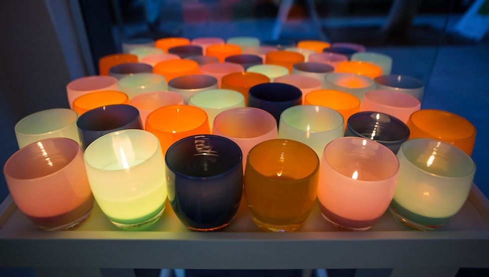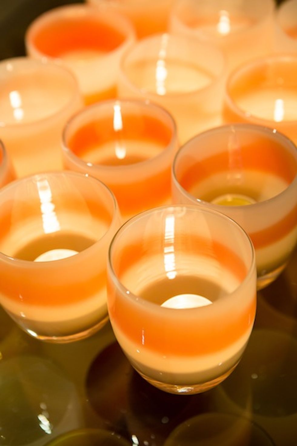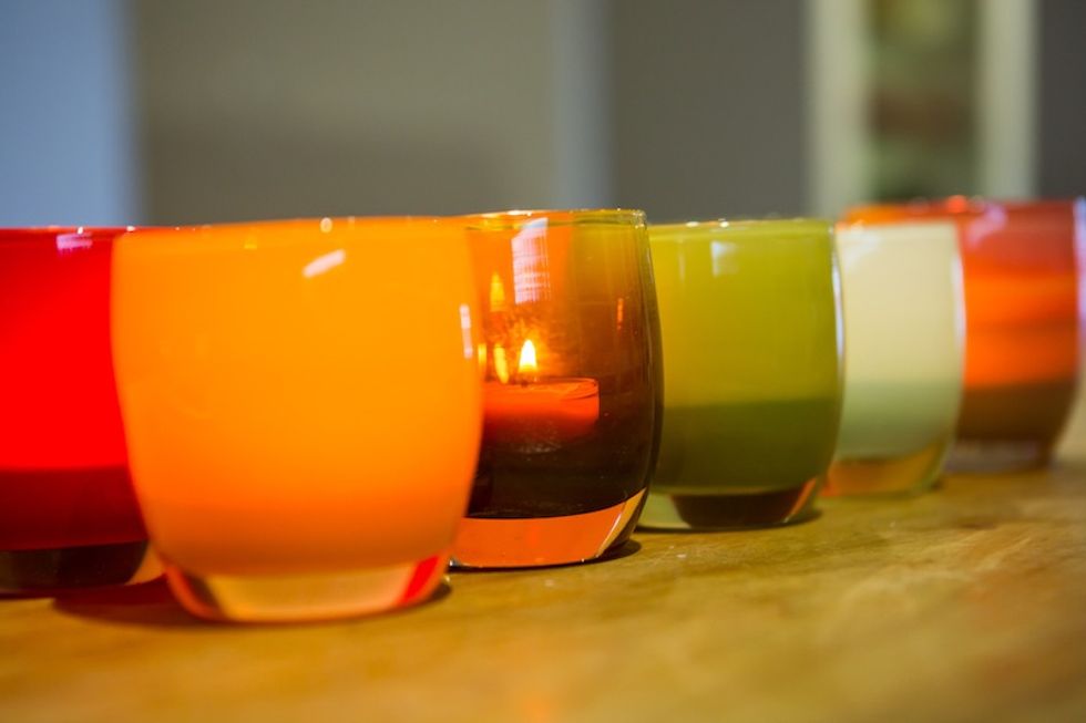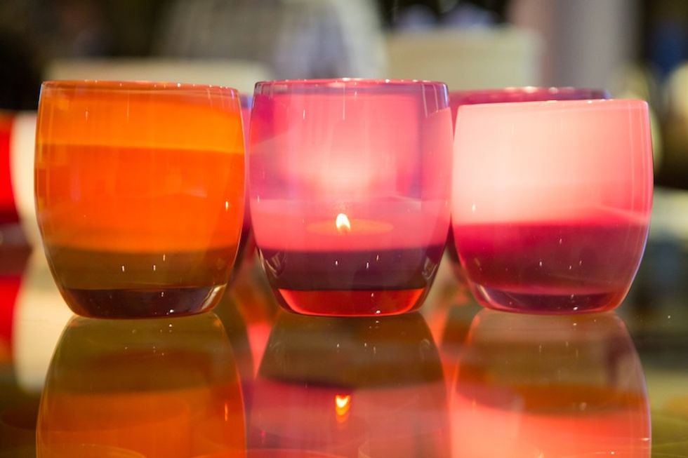 The unique color of each glassybaby comes from the dropping and rolling of the glass, with three layers of glass creating a rich palette of more than 400 colors with names like "frog hunting" (pearly green), "devil dog" (rich plum), and "Jane's Caramel"—warmly soothing bands reminiscent of a creme brûlée. All of the glass votive holders are created by a team of over 70 artists.