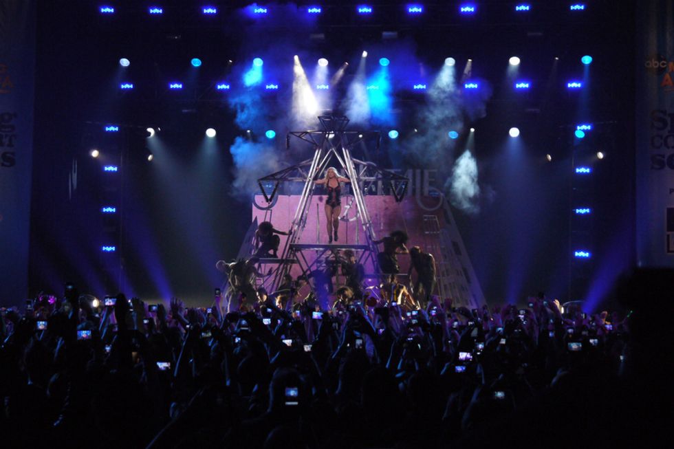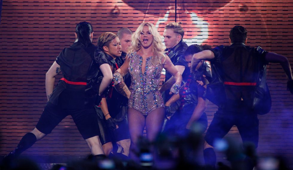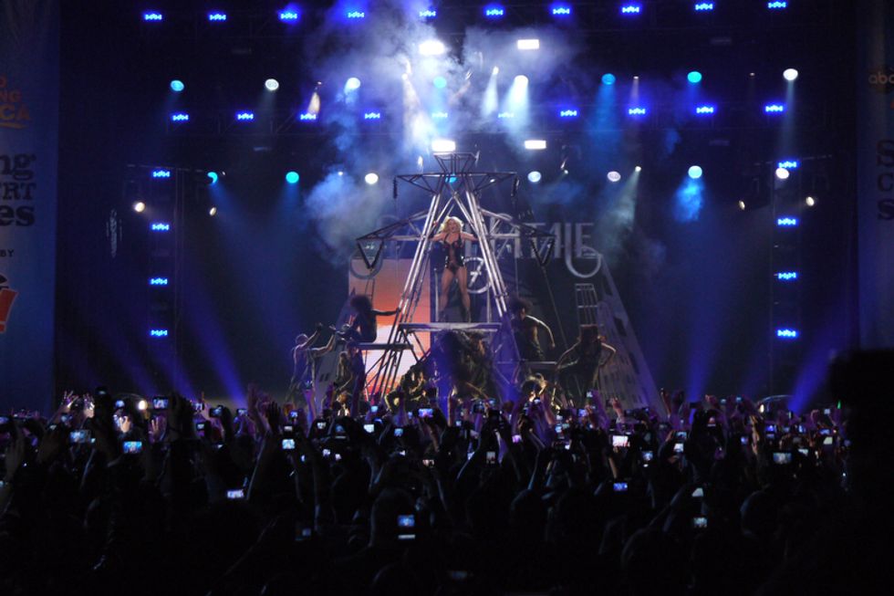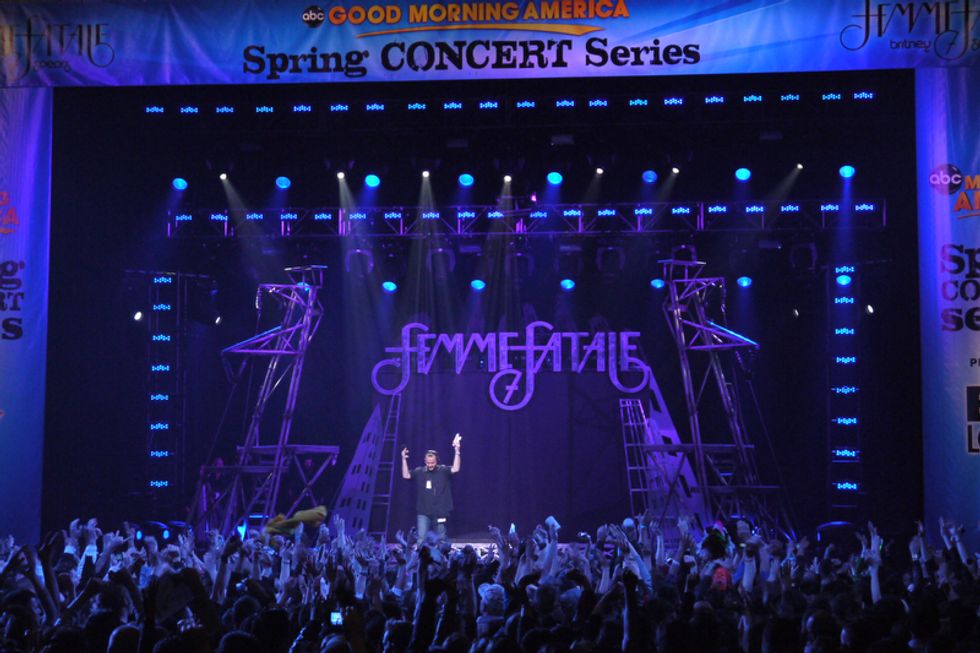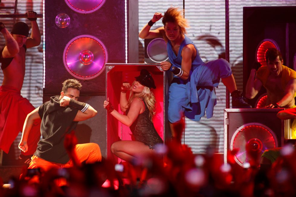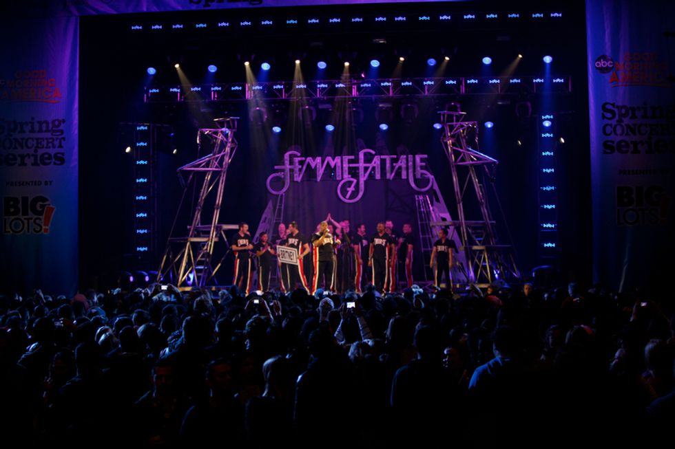 The bonanza was a promotion for Britney's new album Femme Fatale -- and this morning, she sang (lip-synched) and shimmied to three of her new songs ("Hold It Against Me," Big Fat Bass" and "Till the World Ends") for the Good Morning America cameras, which were taping the whole affair to be broadcast on next Tuesday morning's show. Brit's a little careful on stage these days, always looking a bit afraid she's gonna fall (legitimate concern). But she and her fem-bot body suits were looking pretty good -- and did some convincing hip thrusts and confident side-stomps amid an army of 1,000-calorie-a-move backup dancers, explosions and hair blowers. Overall, she put on a pretty exhilarating show. "Till the World Ends," the last and best song she performed, is a seriously pump-ed up party anthem, and is no doubt on repeat at one of the many Castro after-parties this afternoon.