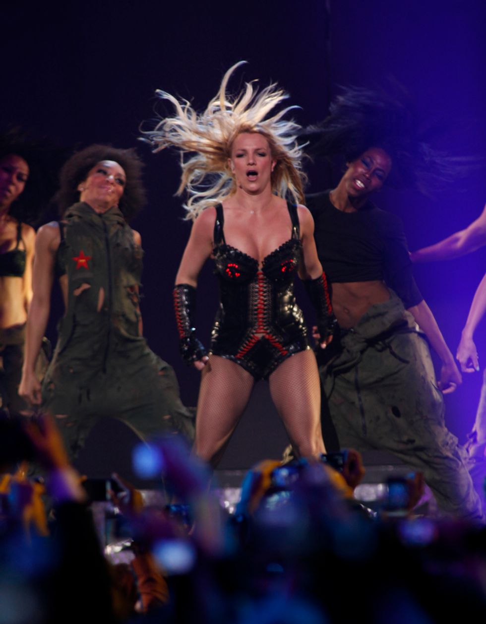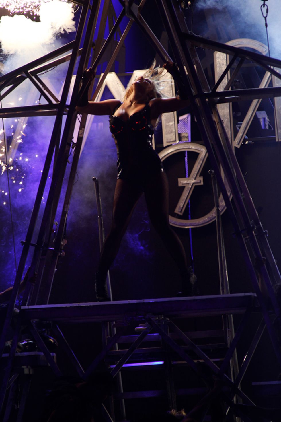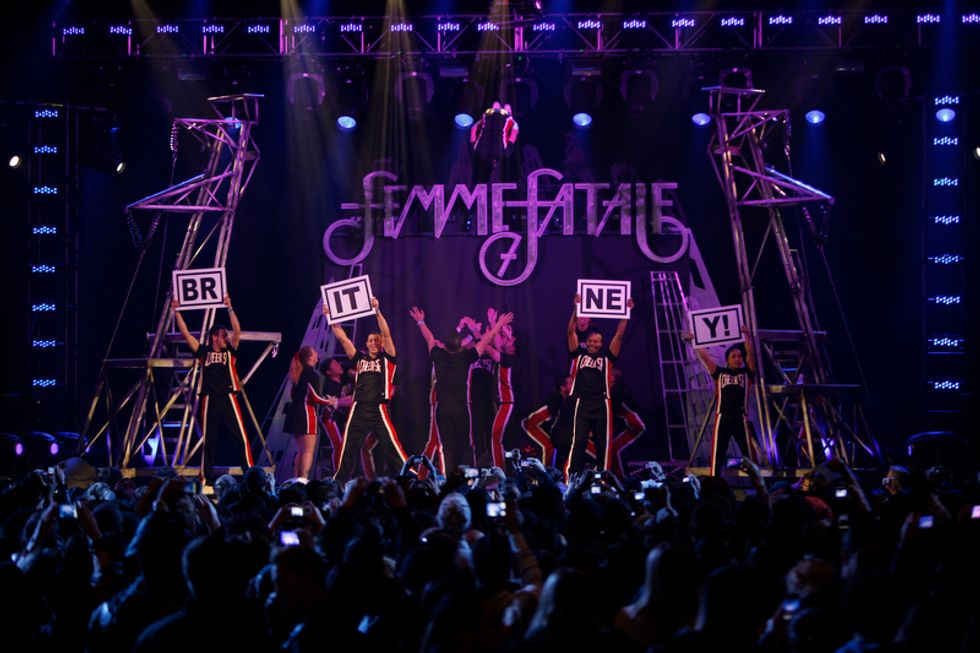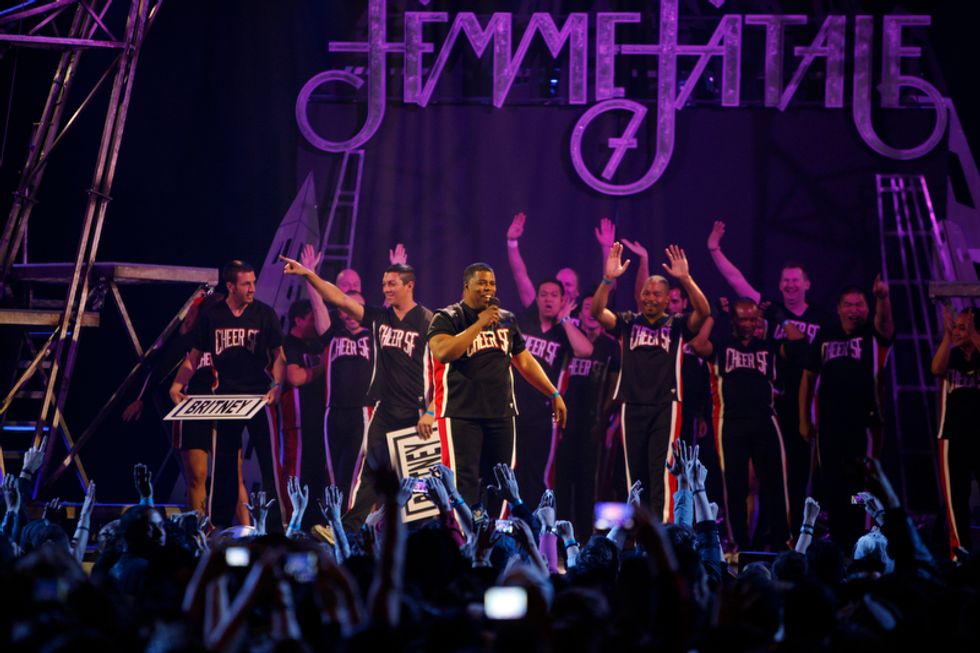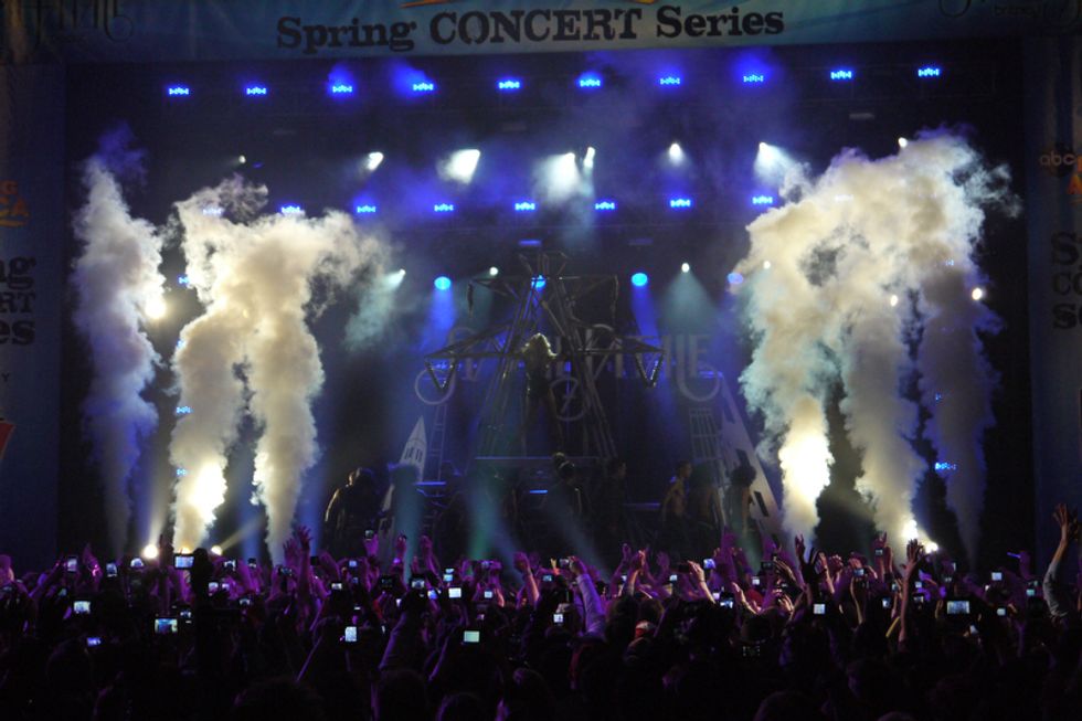 The bonanza was a promotion for Britney's new album Femme Fatale -- and this morning, she sang (lip-synched) and shimmied to three of her new songs ("Hold It Against Me," Big Fat Bass" and "Till the World Ends") for the Good Morning America cameras, which were taping the whole affair to be broadcast on next Tuesday morning's show. Brit's a little careful on stage these days, always looking a bit afraid she's gonna fall (legitimate concern). But she and her fem-bot body suits were looking pretty good -- and did some convincing hip thrusts and confident side-stomps amid an army of 1,000-calorie-a-move backup dancers, explosions and hair blowers. Overall, she put on a pretty exhilarating show. "Till the World Ends," the last and best song she performed, is a seriously pump-ed up party anthem, and is no doubt on repeat at one of the many Castro after-parties this afternoon.