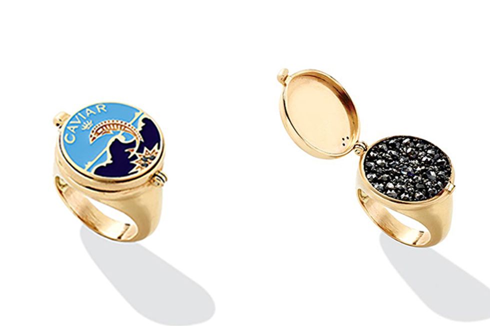 Alison Lou 14K yellow gold caviar ring with black diamonds / $6,830