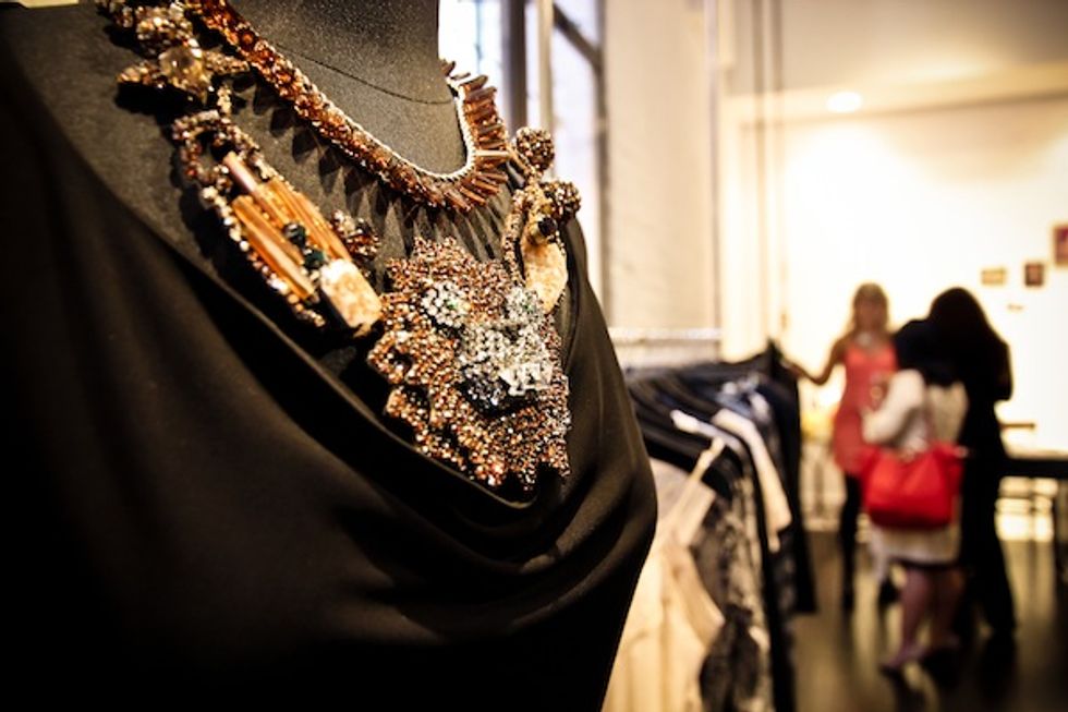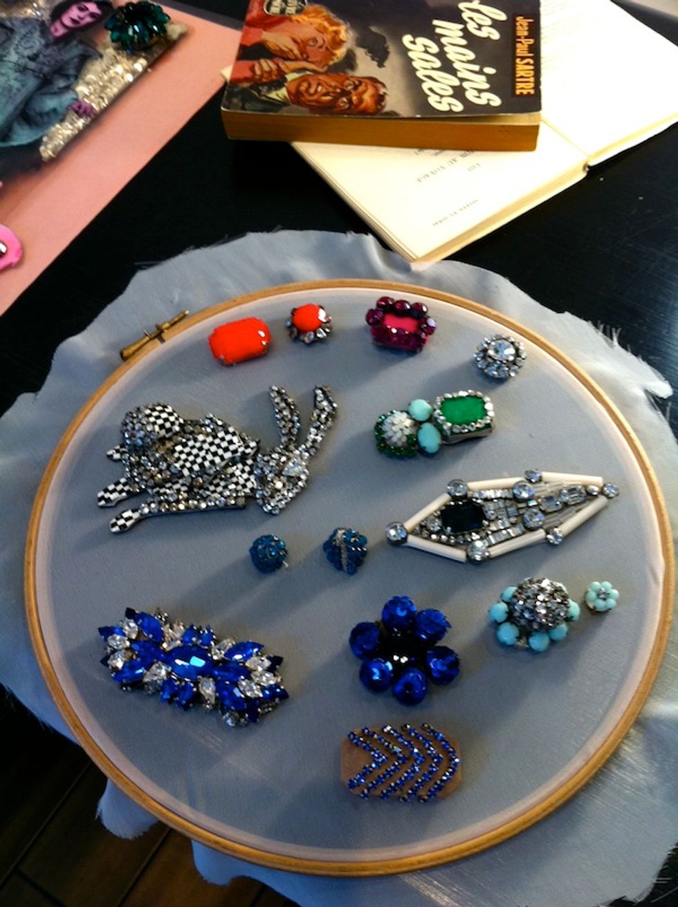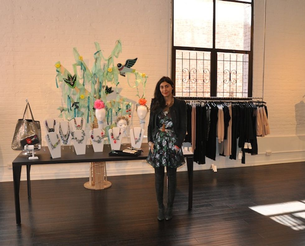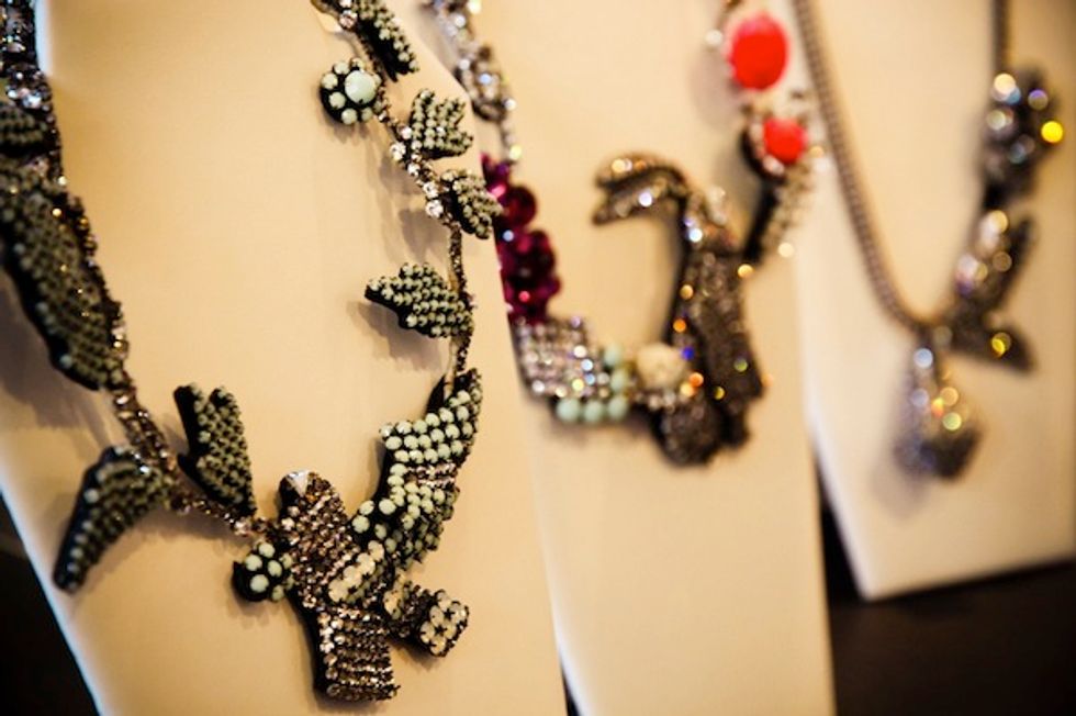 The designer recently visited San Francisco for the first time for an exhibition in her honor. The soft spoken Tunisian beauty hosted a curated collection of necklaces, bracelets, bags, sequin shawls and brilliant Frida Kahlo-inspired headpieces. Everything had an artsy appeal; an elaborate paper tree held twinkling necklaces, while a pseudo atelier was set up to help demonstrate Shourouk's creative process.