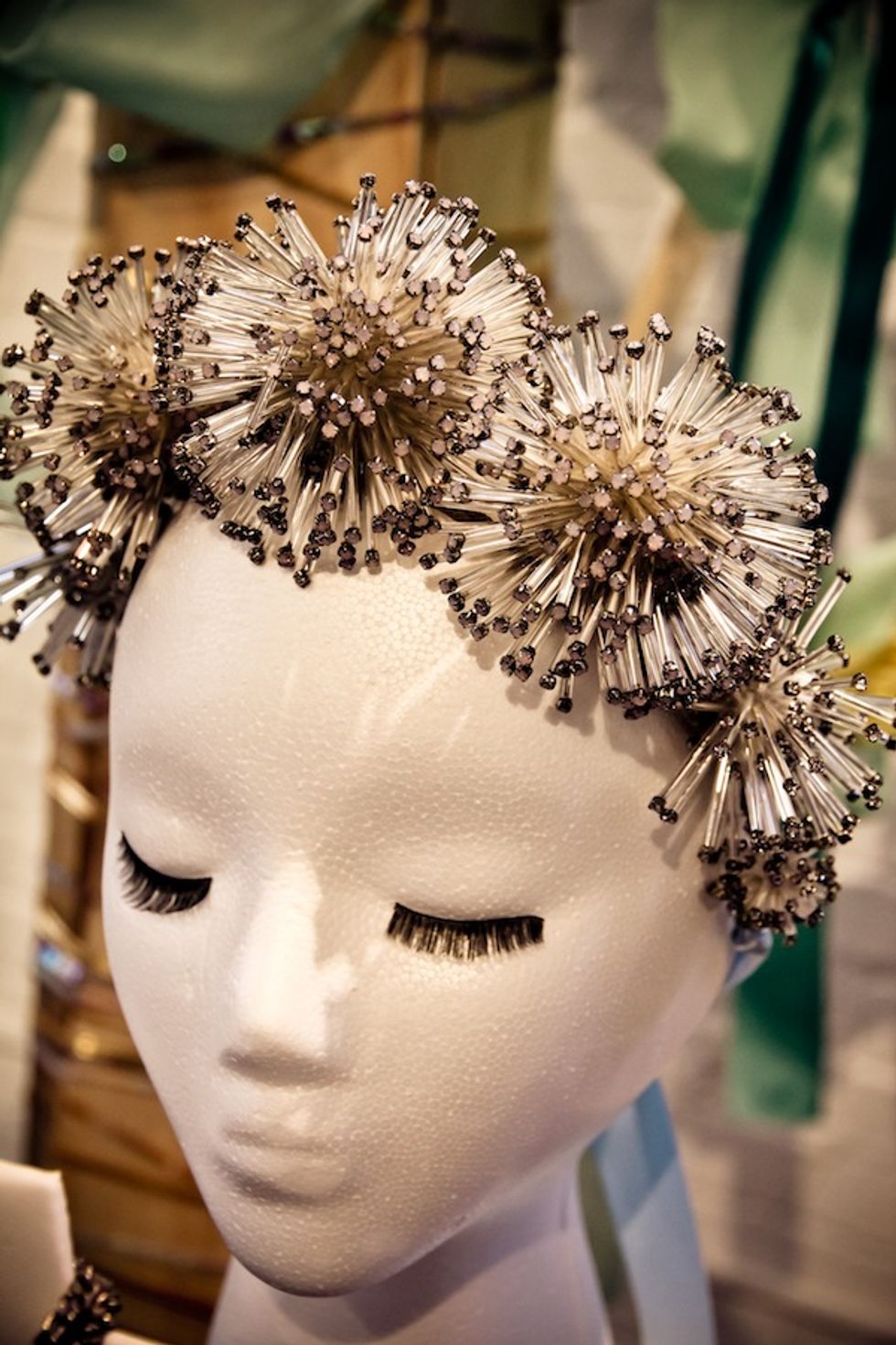 Back to those headpieces. Shourouk is a fan of Frida Kahlo and fashioned the silk flower, Swarovski crystal, bead, and sequin pieces after learning about Kahlo's once-upon-a-time residency in the foggy city. Concurrently, Lady Gaga is a fan of Shourouk — the icon recently bought one of her spiked Ursula headpieces.