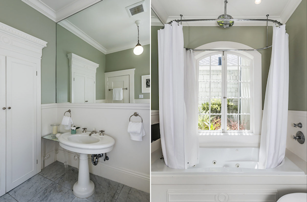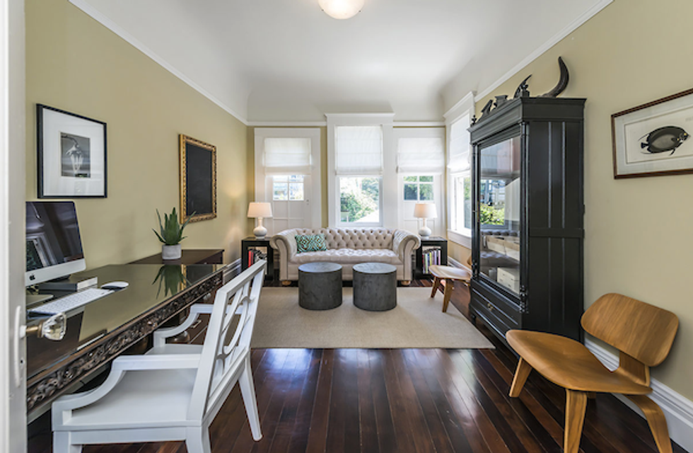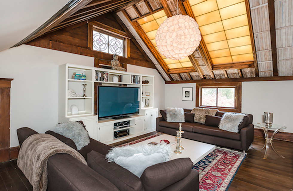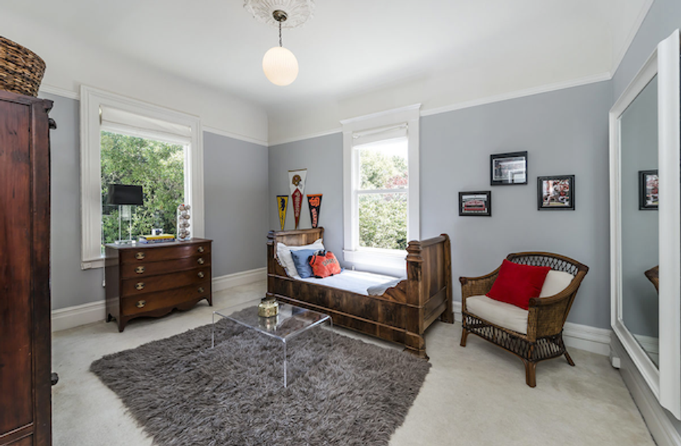 Other luxe amenitites include a top-floor media in case anyone wants to sneak way to binge-watch Game of Thrones; a backyard with a firepit for parties on chilly nights; three-car parking; and many of the original period details including stained glass windows and inlayed floors.