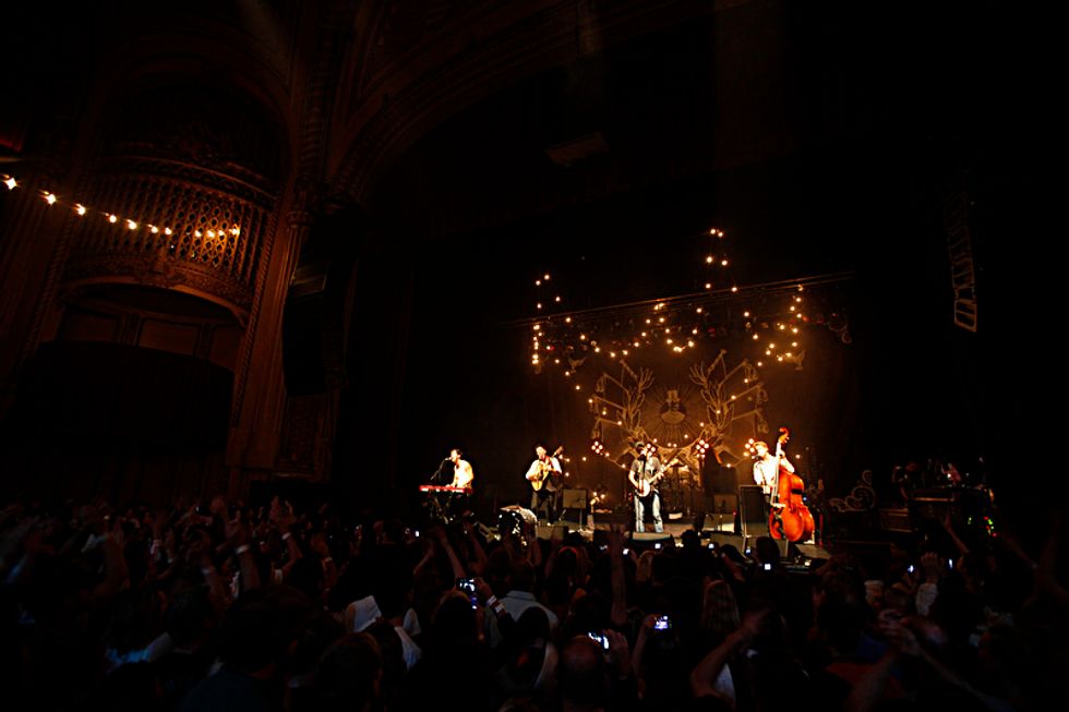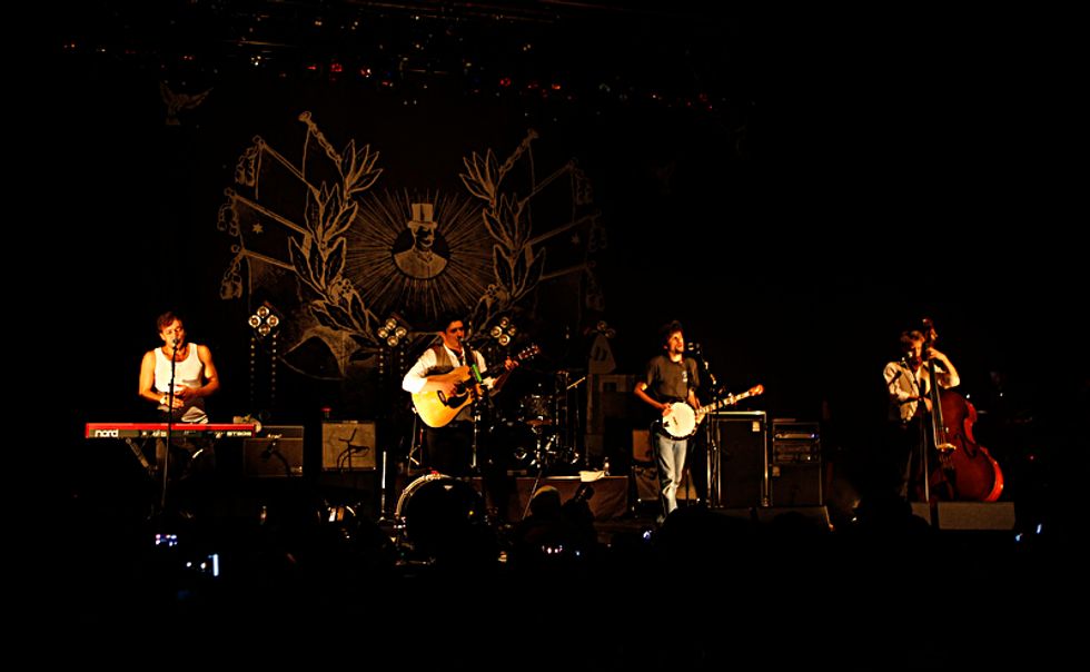 Last night was a big night for San Francisco: the Giants won, and Mumford & Sons played at the Warfield. Lucky for the band, the game wrapped up before they took to the stage, marked by a surge of cheers from all of the orange and black-clad Mumford fans glued to their droids on the dance floor. But Mumford was forgiving of the distraction, and even encouraged the random chanting (“Let’s go, Giants!”) when it arose, no matter how awkward (the band was brought out for the encore to a chorus of: “Let’s go, Mumford!”).