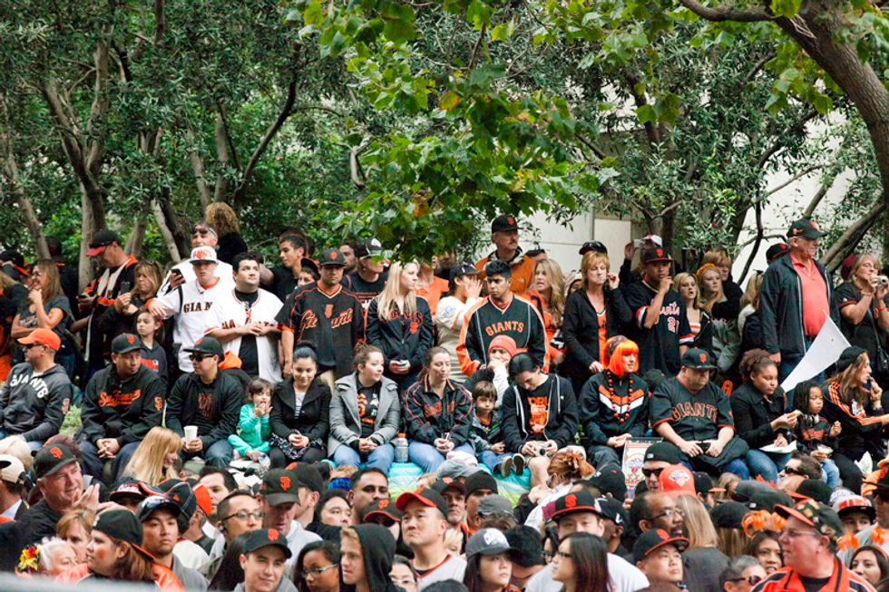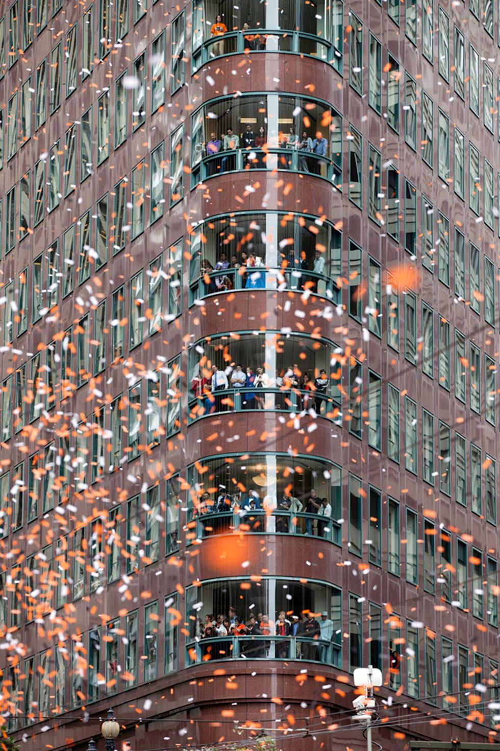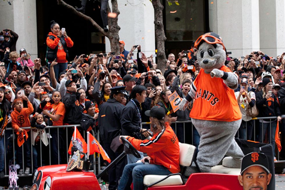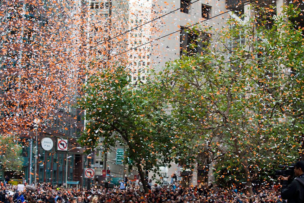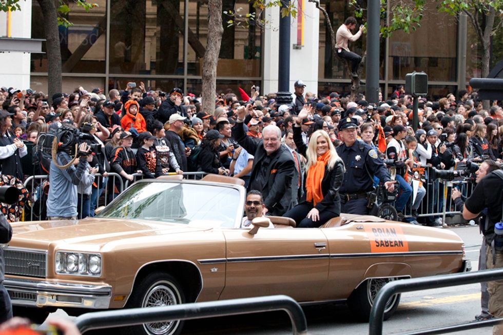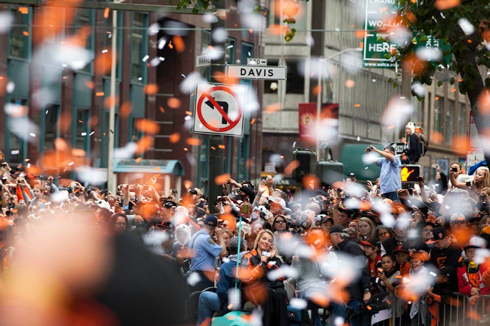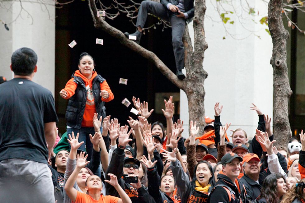 Everyone either skipped work or school to be there, and there must have been thousands, if not hundreds of thousands at the Giants' Victory Parade down Market Street today. We'll have to wait and see if the record from two years ago of a million was beaten. The mash-up of Halloween and the parade was the ultimate celebration for Giants fans from all over California. Maybe we took a photo of you. If not, there's always next year. GO GIANTS.