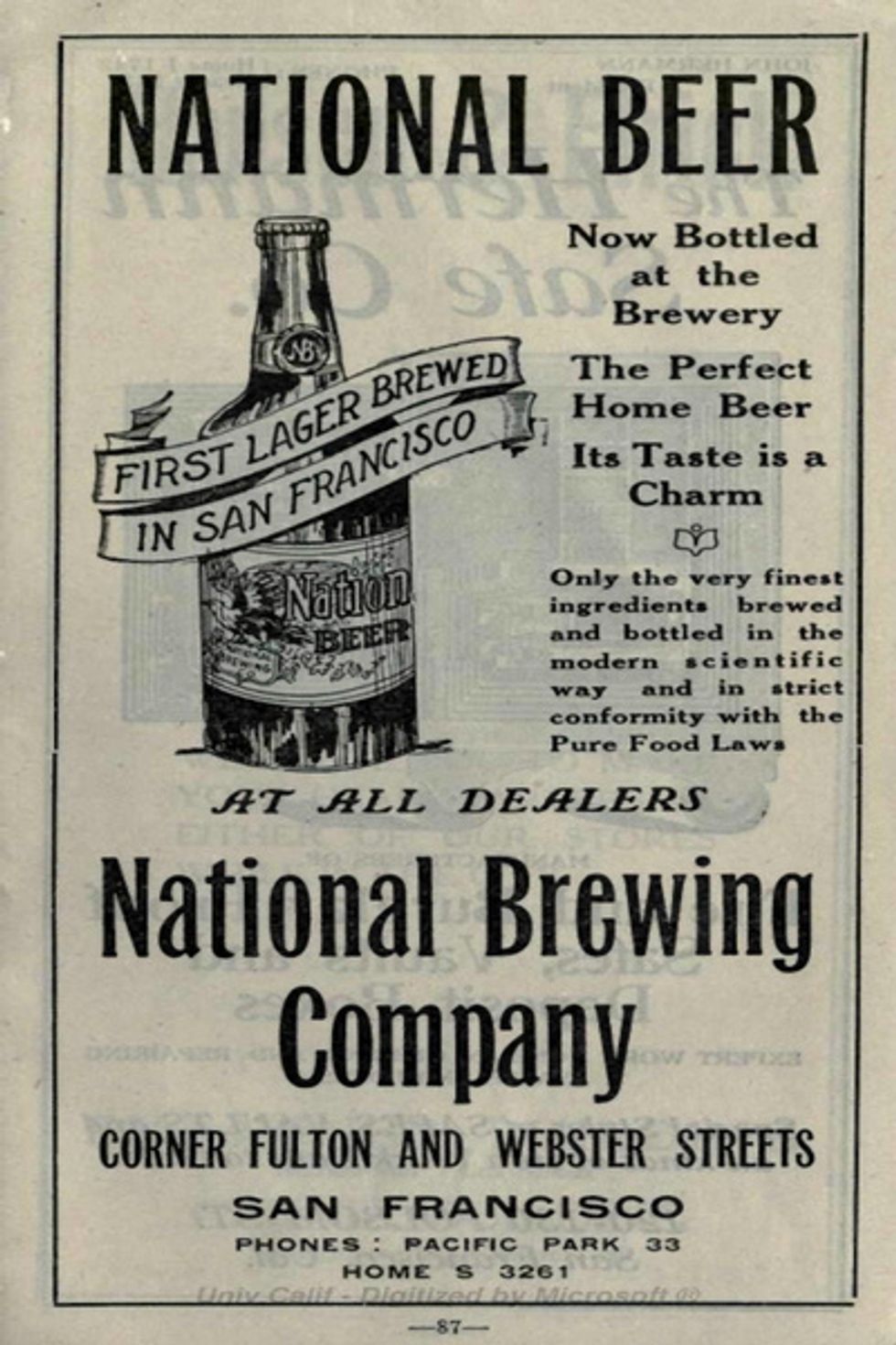Founded by John Glueck and Charles Hansen, the National Brewing Company operated in San Francisco from 1884 to 1916. They were located at the corner of Fulton and Webster Streets.