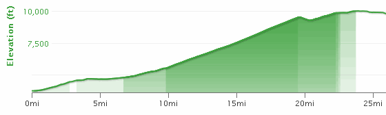 At just past nine miles, the grade picks up and the climbing begins in earnest. The first switchback is three miles long and nets you 1,300 feet at a pretty steady 6-7% grade. The views to the White Mountains to the west and Owens Valley are beyond stunning and make for a good distraction from the next notch of suffering you’ll encounter on the second switchback. This one's shorter at one and half miles, but now tilting at 7-8%. At 14 miles, and the start of third section, you’ll be at 7,000 feet. As you near the fourth dogleg, you might see hang gliders launching into the abyss below if conditions are right. Hopefully, your physical and mental condition are right as well, for the average pitch once again tilts upward, averaging 9% as we turn back to the west and leave the valley views behind. The approach to the final climb commences after you’ve made the false summit at mile 19.7 (at 9500 feet), so enjoy the brief downhill, as you’ve got 4.3 miles and 750 feet more to the meadow before you end this self-flagellation at 10,011 feet above sea level. As you may have suspected, this climb manages an HC (beyond category) rating.