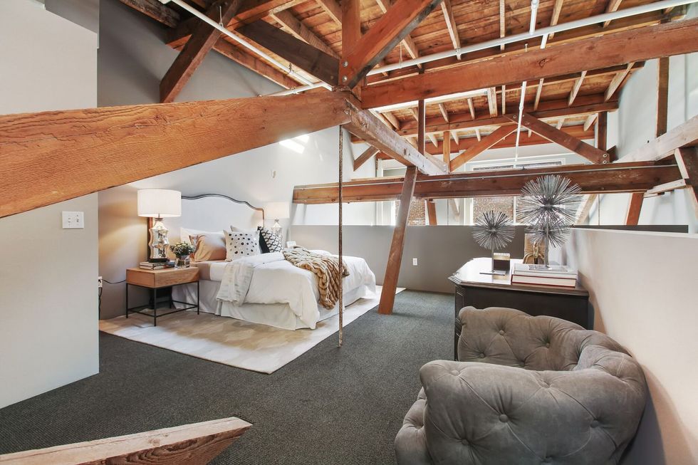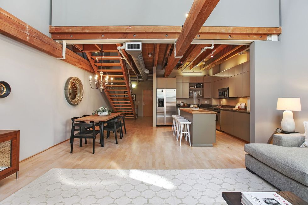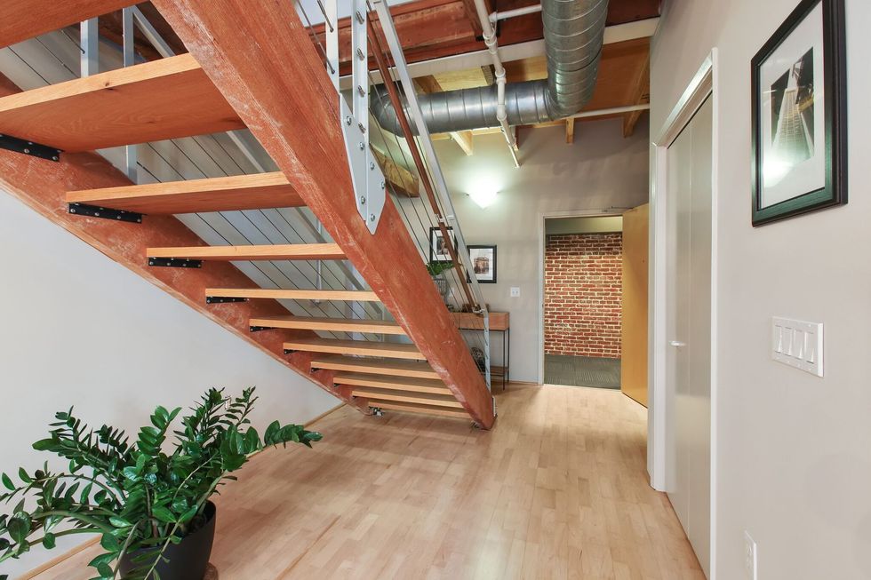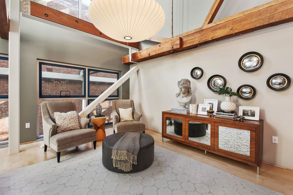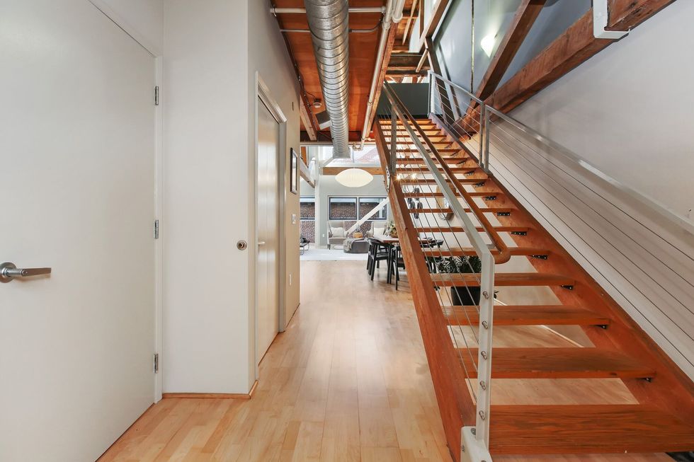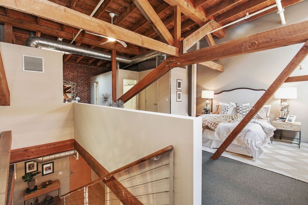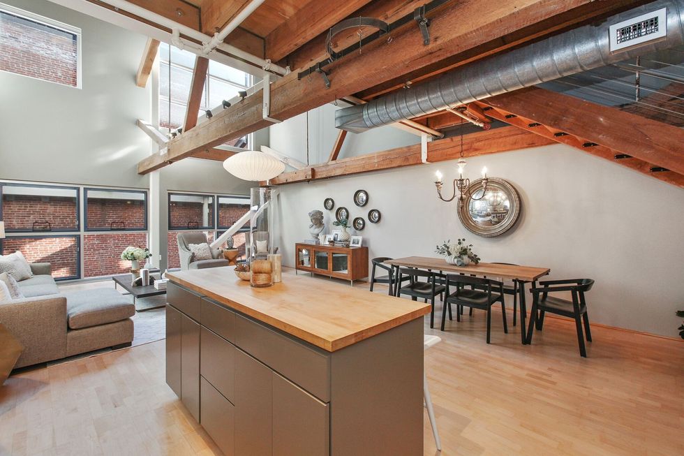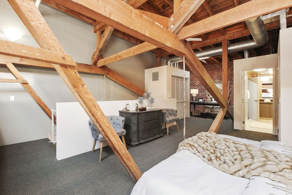 Just a block off the palm-lined Embarcadero and a Hunter Pence swing from AT&T Park, but tucked into the quiet enclave of Delancey Street and partially obscured by trees, the 66-loft building has an air of privacy and a vintage vibe, retaining many of the original qualities that give the warehouse so much character. Recently to hit the market, Loft 304 is all you'd expect from a converted industrial residence in SoMa: 20-foot ceilings, skylights, dramatic windows, hardwood floors, and, the highlight, original exposed brick and timber beams.