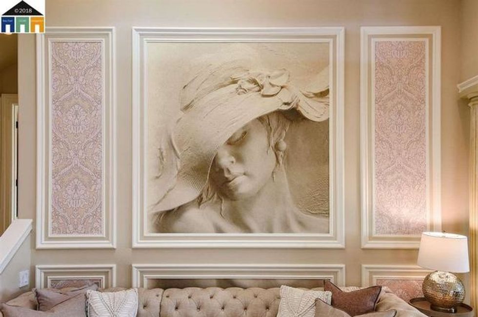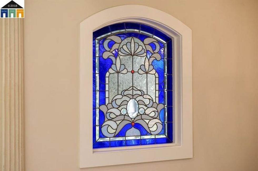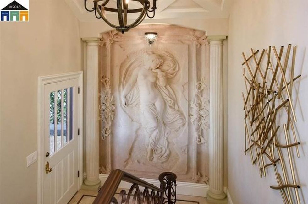 Step through the front door to be met with a towering floor to ceiling sculpture of what appears to be the Roman goddess Venus hugged between two Doris columns. Venus, people. Doric columns. You won't find this in SF for under $10 mil. Overhead is a rustic, six-light chandelier pinned to cross-hatched ceiling. Up the swirling wrought iron balustrade to the main level is a stained glass window casting a bluish glow.