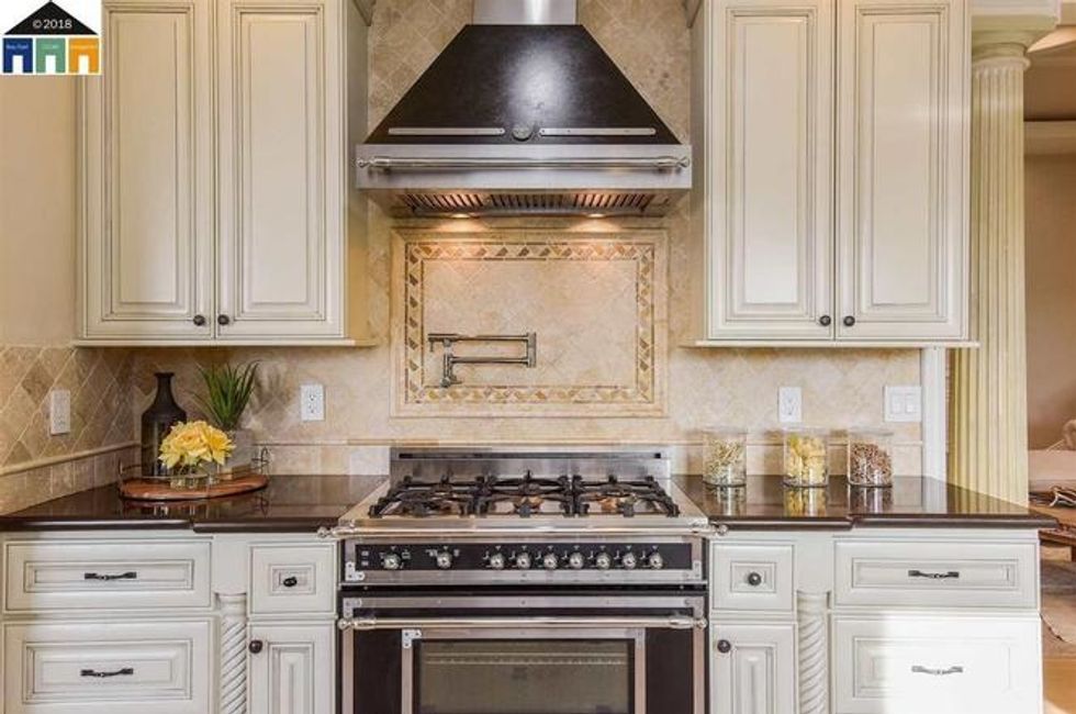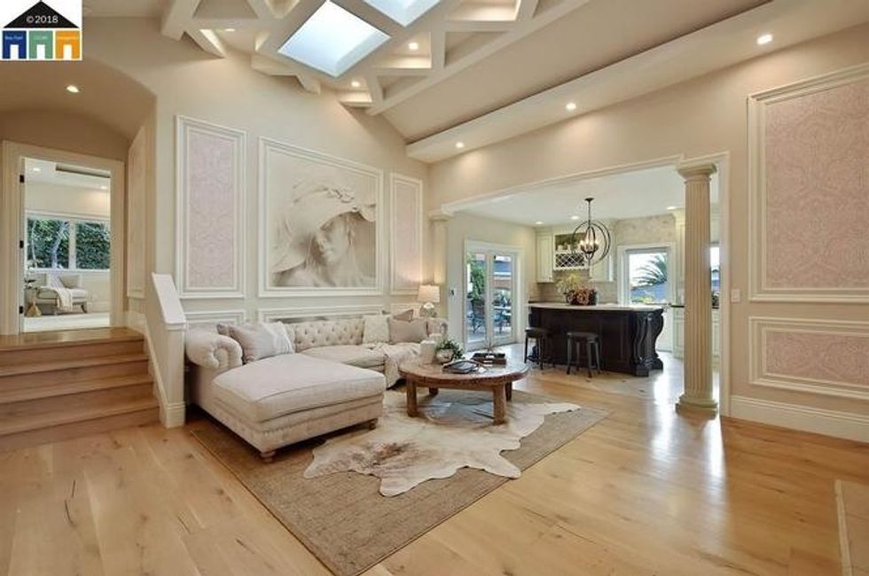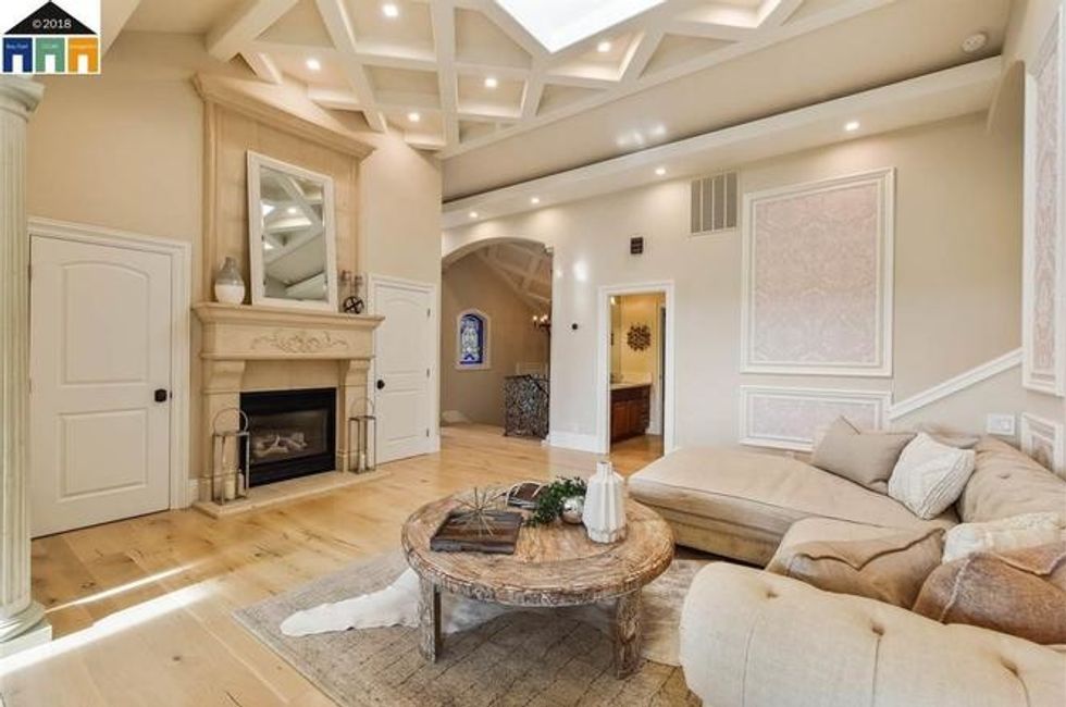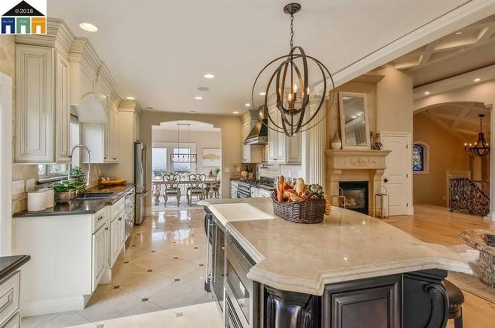 Atop the stairs you're met with another artsy nook—an arched stone shelf, perfect for a painting. On either side are seating areas with the same thatched ceiling. To the right, a trio of windows floods the room in natural light while a modern fireplace adds a sense of coziness. The attached dining room here opens up to a patio with sweeping views, and the chef's kitchen is a sight with marble flooring, stone counters, an island with breakfast bar, a chic black gas range, and wine storage. Two doors lead to a balcony on one side and a manicured backyard on the other. In the second sitting room is a yet another carved fireplace plus double skylights overhead. Don't worry—you can probably rip out the floral wall panelling.