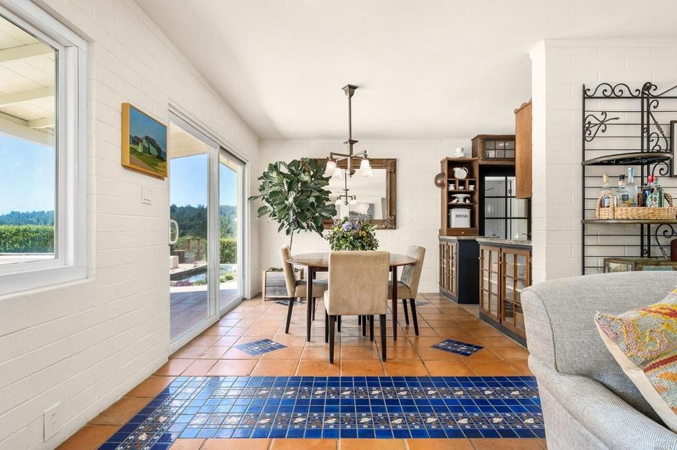 A spacious living room with a white brick fireplace is encircled by blue, floral tile flooring with a bright dining area. The kitchen has wood uppers and stainless steel appliances.