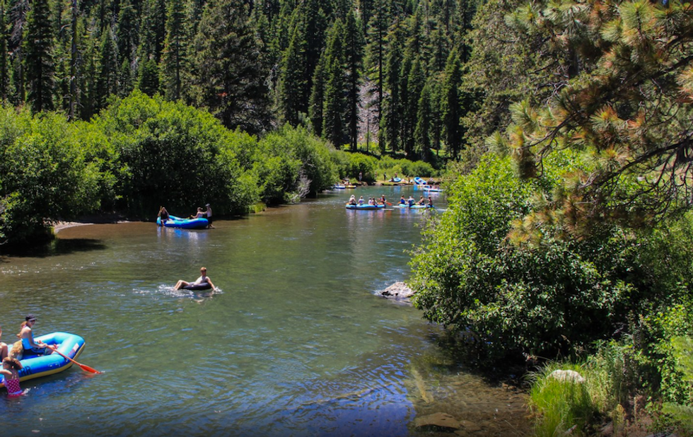 Flowing out of the northwest corner of the lake at Tahoe City, the Truckee runs north through a forested river canyon. The first 5 miles of the river, the float stretch, are calm with the occasional light rapid to break up the flat water. The float takes between 2-3 hours, passing through meadows and opening to occasional mountain views. The river parallels Highway 89, which sees a fair amount of summer traffic, but with attention focused on enjoying the river and cooling off, you'll hardly even notice. A shallow river bottom and plenty of accessible banks afford the opportunity to stop and soak up the setting along the way. The take-out is located at River Ranch Inn, near the entrance to Alpine Meadows. Read more.
