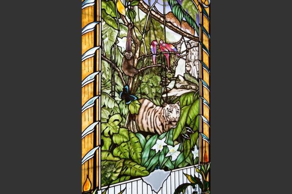 The first thing you'll notice here—besides, perhaps, the grand black-painted staircase and the high box-beamed ceilings—are the many eye-popping stained glass windows with wonderfully wild themes: There's a veritable deep sea wonderland of swimming sharks, fish, and algae; a lush, tropical rainforest with a tiger, monkey, and rainbow parrots; bountiful florals; and dragons selected by Cage himself—all tucked inside intricate architectural reliefs.