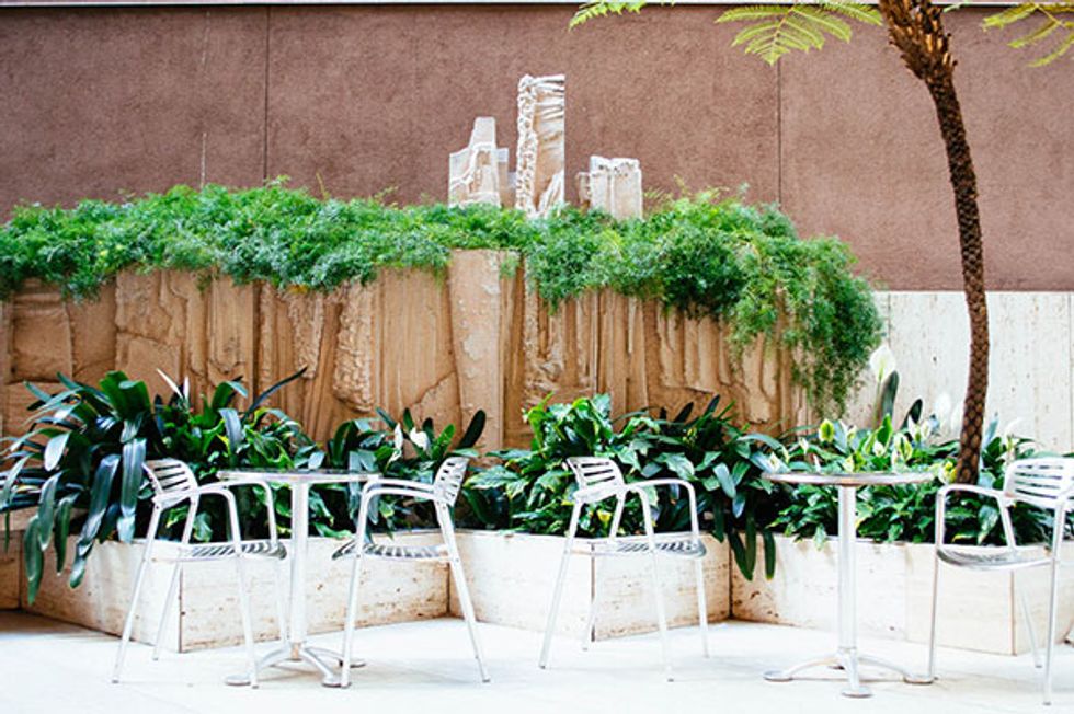 Hidden directly behind the lobby, the garden at 100 Pine Street is the most modern of the POPOS. Small with metal chairs, black granite floors, sculptures, and a pleasant fountain, this gem feels like a museum. It gets less sunlight, but the materials and the design make up for it. There is a small café bar on the site. // Open: All week, 9am–6:30pm