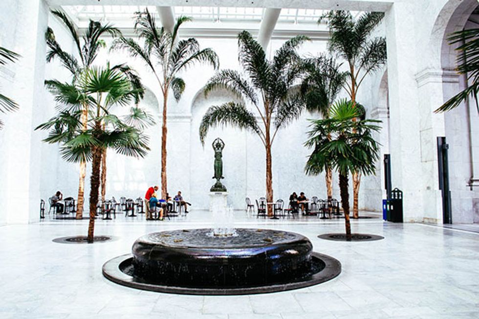 Found inside the former London-Paris Bank built in 1912, this space comes complete with glass roof, white marble floors and walls, black marble fountain, ceiling high palms, and a bronze statue that lends the plaza an elegant Old World vibe. Open: At all hours