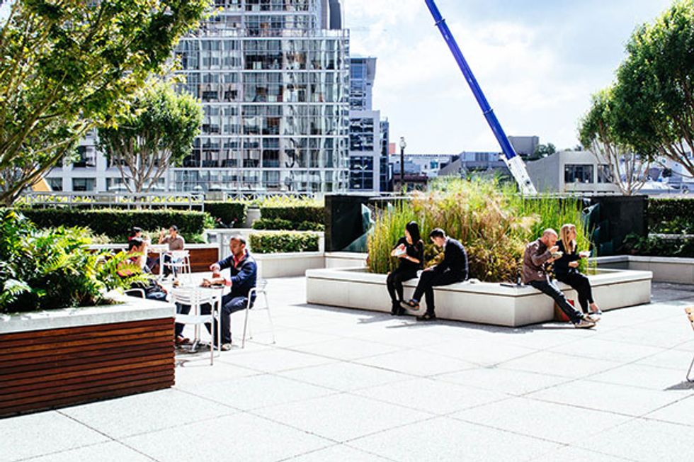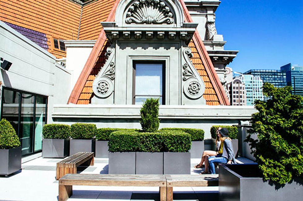 Already the lobby of this building is impressive with its spacious entry and the moody 20's feel. But don't be intimidated, just take the elevator to 15th floor and step out into sun filled terrace high above the city. This huge space has tables & chairs, as well as benches under trees. You can soak up some sun, take in some amazing views of the city form the elevation, and even catch a glimpse of the Bay. // Open: Mon–Fri, 9am–6pm