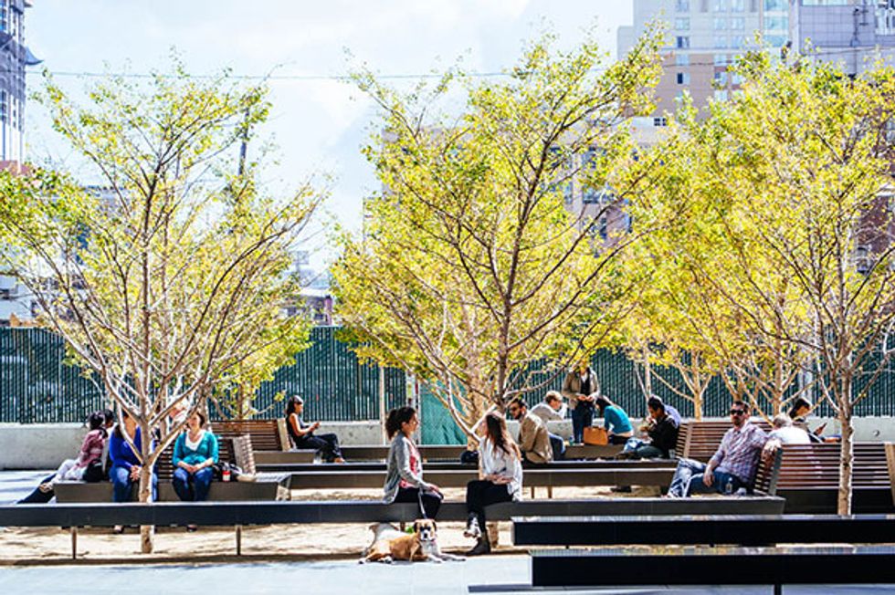 When entering this plaza on Mission Street next to the LEED Gold office tower, you're greeted by Jonathan Borofsky's huge and colorful Human Structures and three unique sculptures of heads by Ugo Rondinone, set in front of a green living wall. In the back, benches are inviting you to have a break under Gingko trees. Open: At all hours