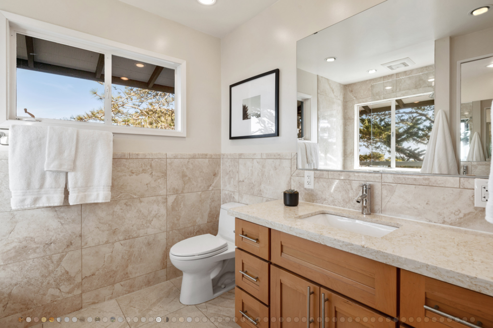 Beamed wood ceilings in the living spaces are made all the more soothing with recessed mood lighting crowning the perimeter. A marble fireplace and built-in shelving anchor the minimalist living room. The open floor plan connects this space to a bright dining room with two windowed walls and an efficient kitchen with a center island, ample storage, and a breakfast nook.