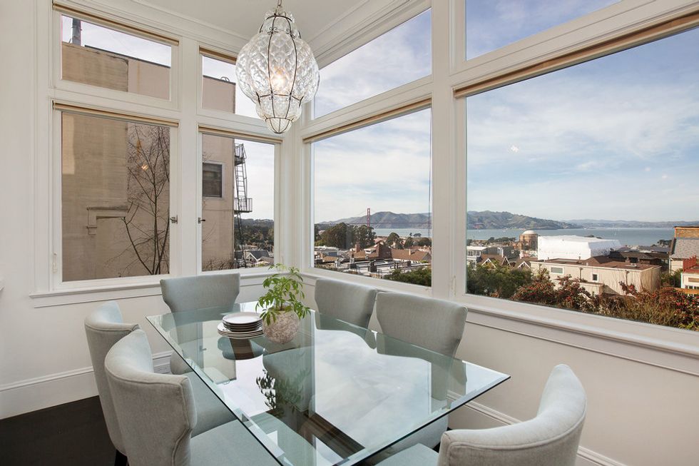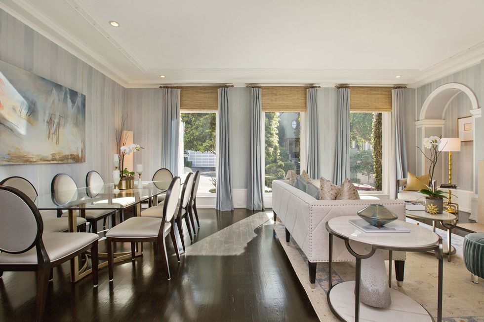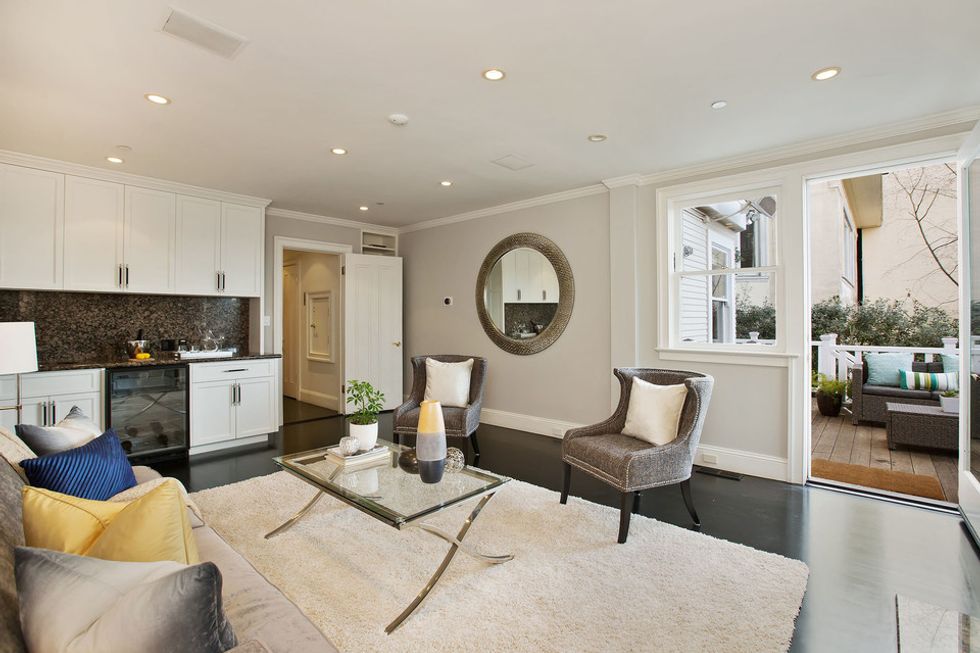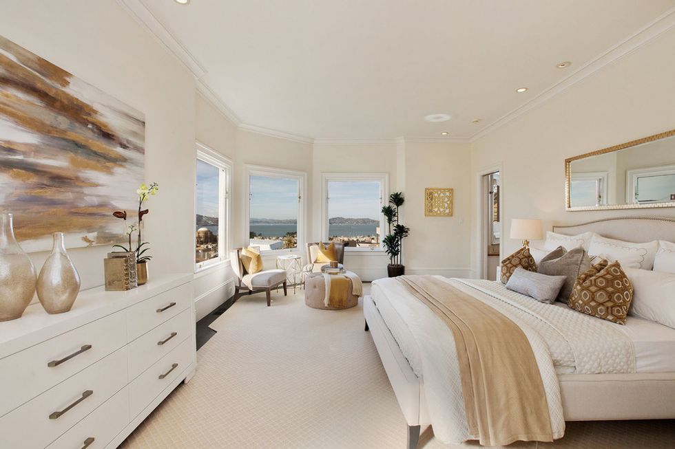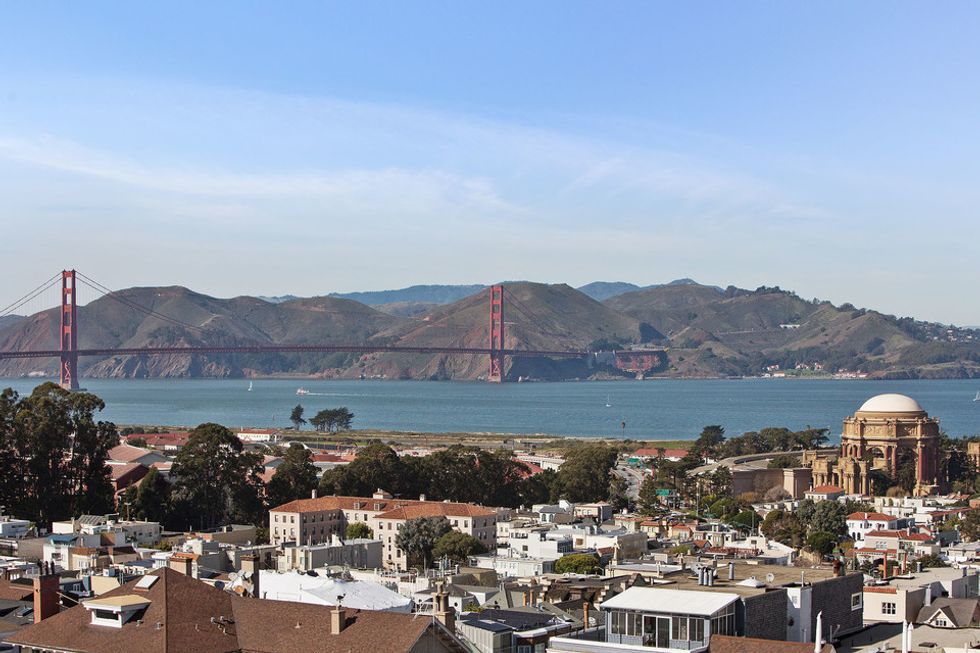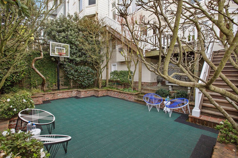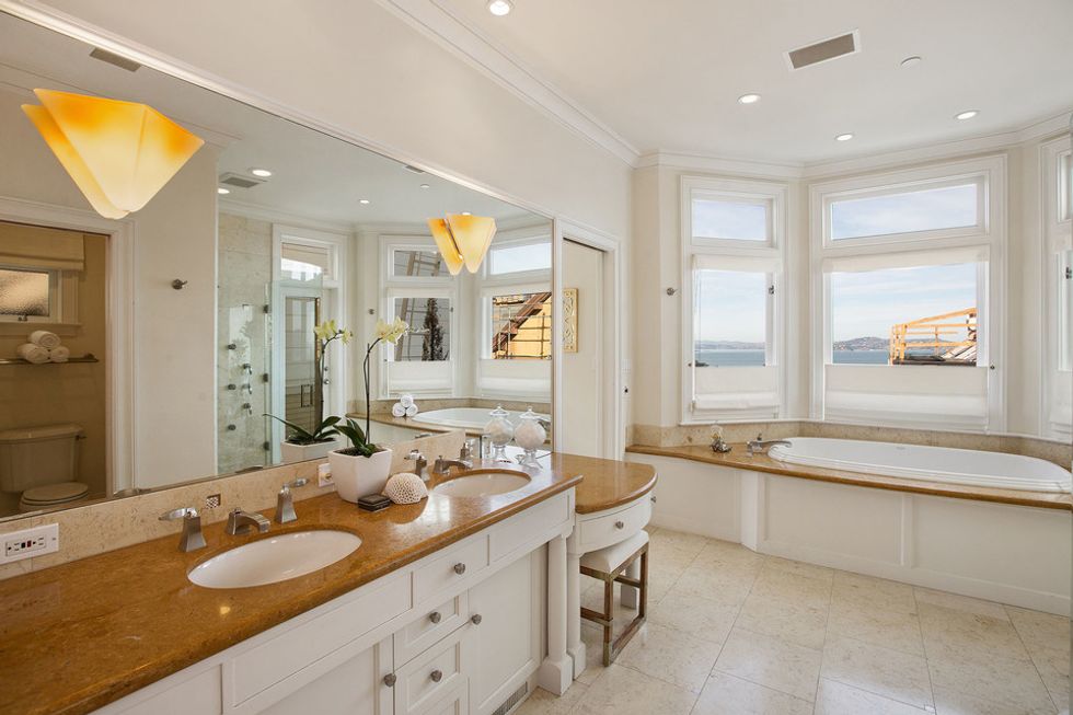 Formal spaces for living, dining, and lounging all have luxurious touches—a stylish minimalist fireplace, large soaking tub, marble countertops, and a garden are just some of the creature comforts. After work, imagine parking your Tesla in the two-car garage, shooting hoops on your private B-ball court before dinner, and then making a quick stop in your wine cellar to select a vintage for an exquisite meal prepared in your eat-in kitchen. Finish the bottle on the deck, where sweeping views of the Golden Gate Bridge, Palace of Fine Arts, and the bay will remind you why you paid $14 million.
