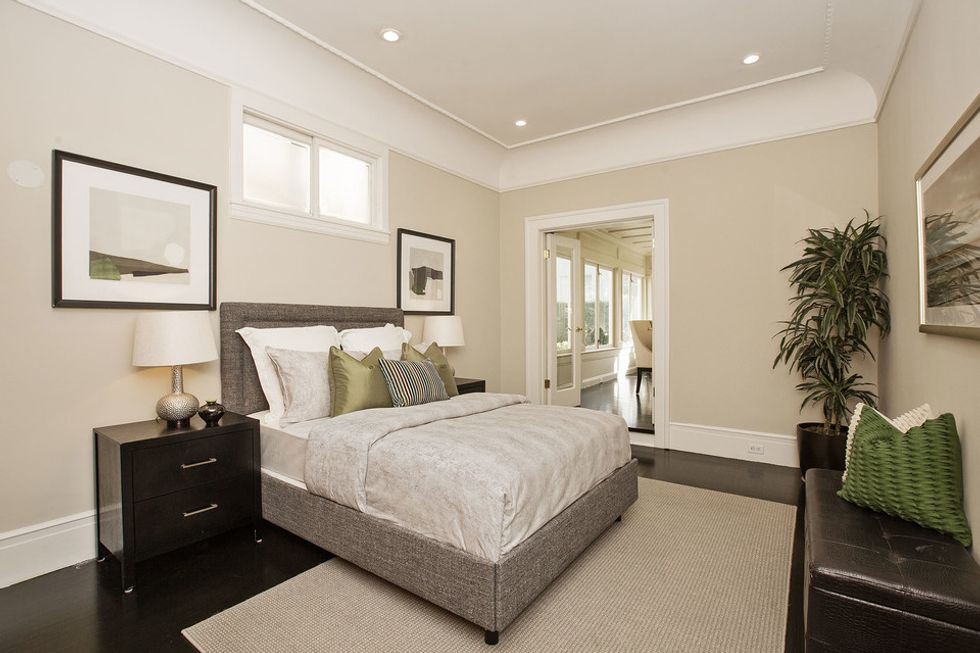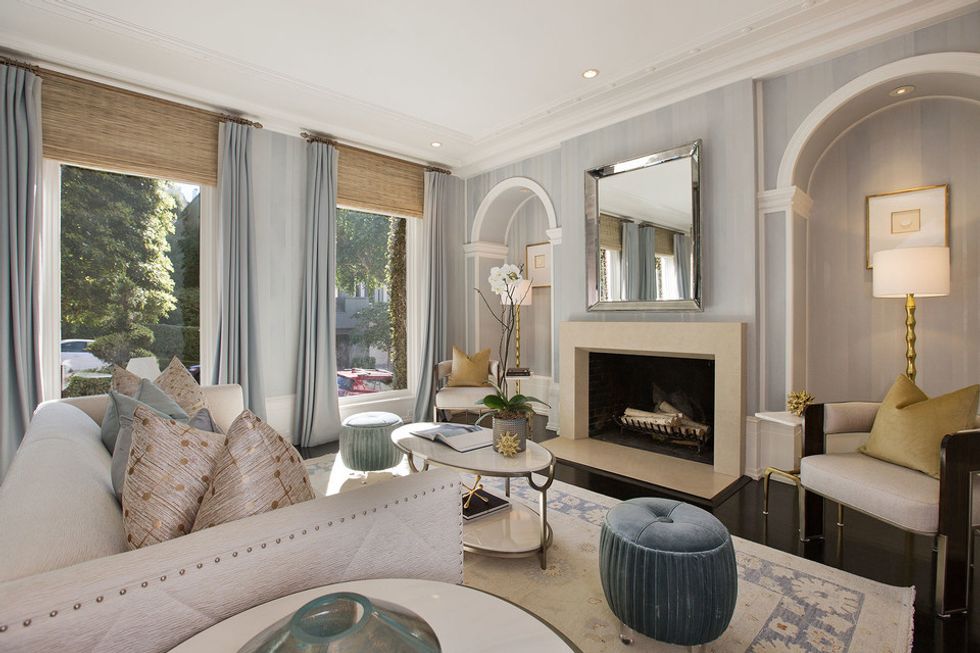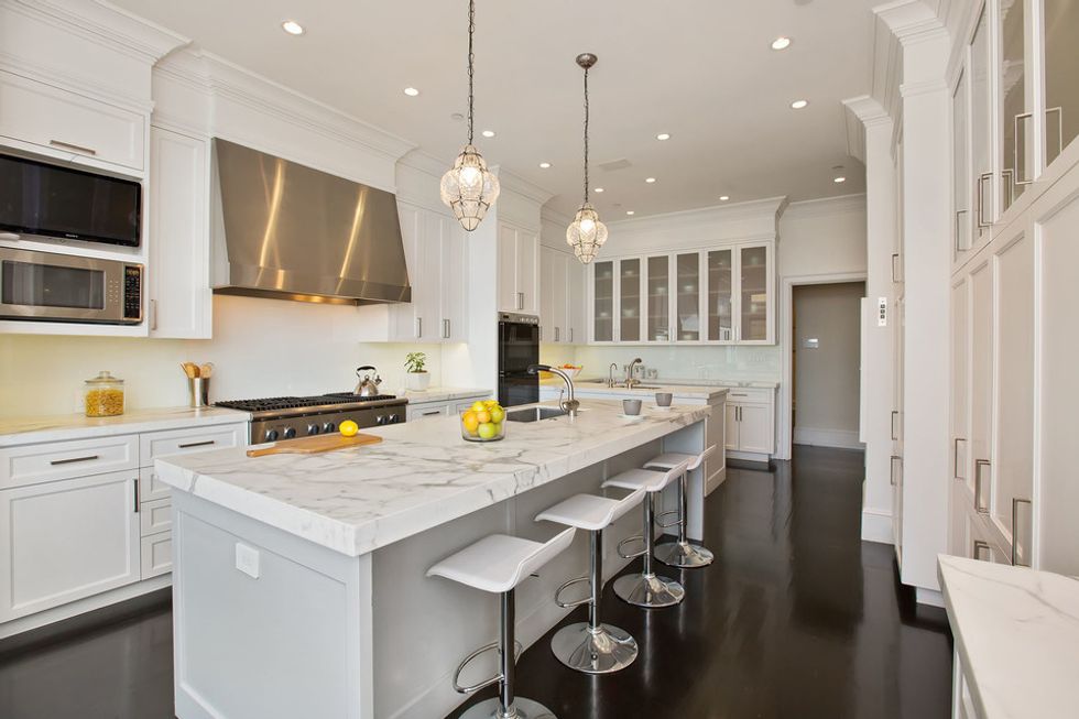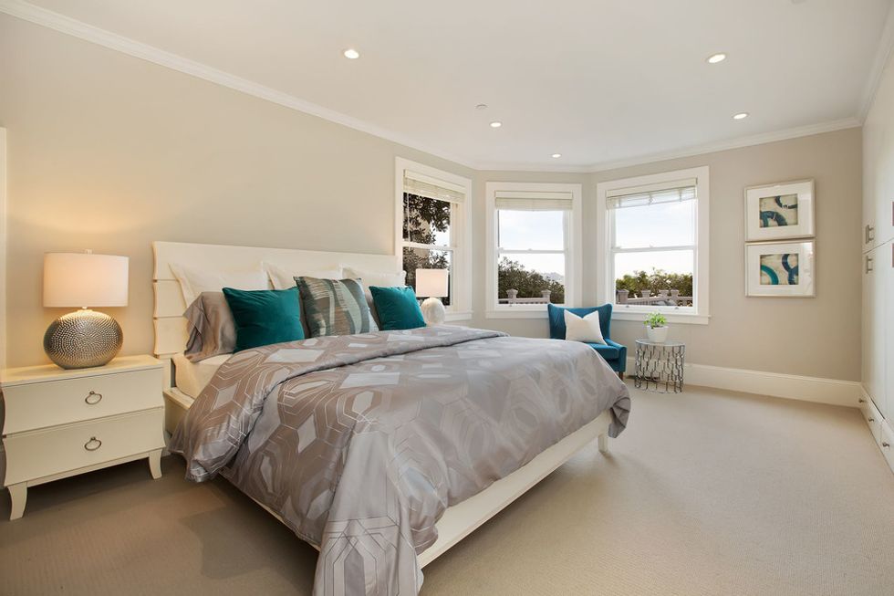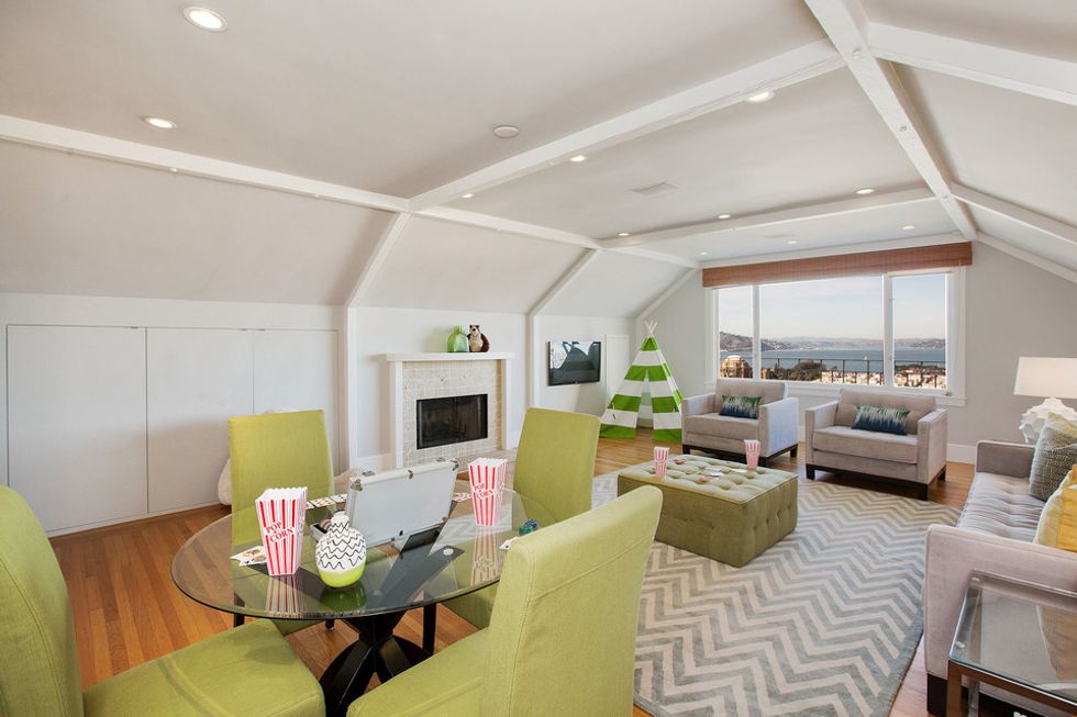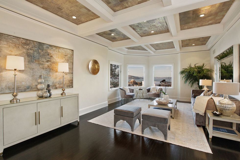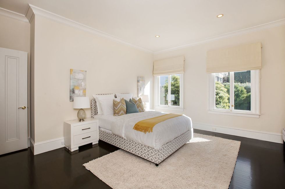 Formal spaces for living, dining, and lounging all have luxurious touches—a stylish minimalist fireplace, large soaking tub, marble countertops, and a garden are just some of the creature comforts. After work, imagine parking your Tesla in the two-car garage, shooting hoops on your private B-ball court before dinner, and then making a quick stop in your wine cellar to select a vintage for an exquisite meal prepared in your eat-in kitchen. Finish the bottle on the deck, where sweeping views of the Golden Gate Bridge, Palace of Fine Arts, and the bay will remind you why you paid $14 million.