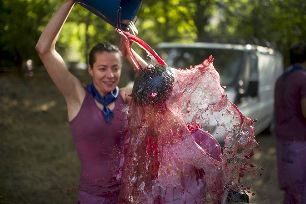 Wine fight! A traditional bota bag is your BFF during this fest. The leather-covered bladder holds the wine you'll be shooting down your throat, streaming at other revelers, and getting refilled all day with the regional vino tinto. The event is in commemoration of a border dispute that has since evolved into a purple, drunken free-for-all. Everyone wears white, but that doesn't last long. // Jun 28-30, 2016; Haro (Spain), wine-fight.com