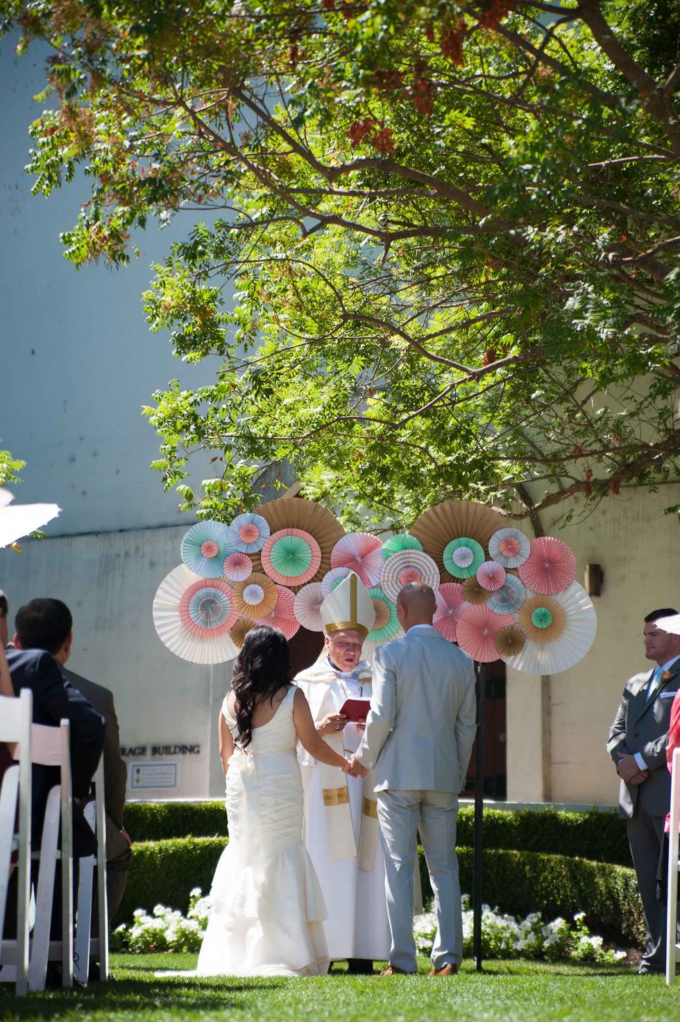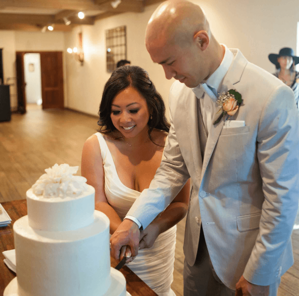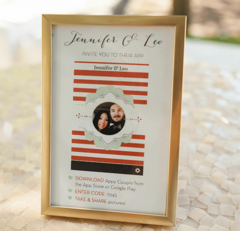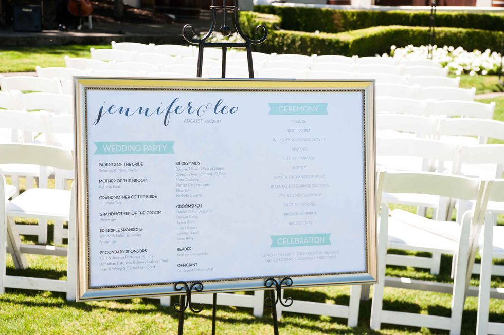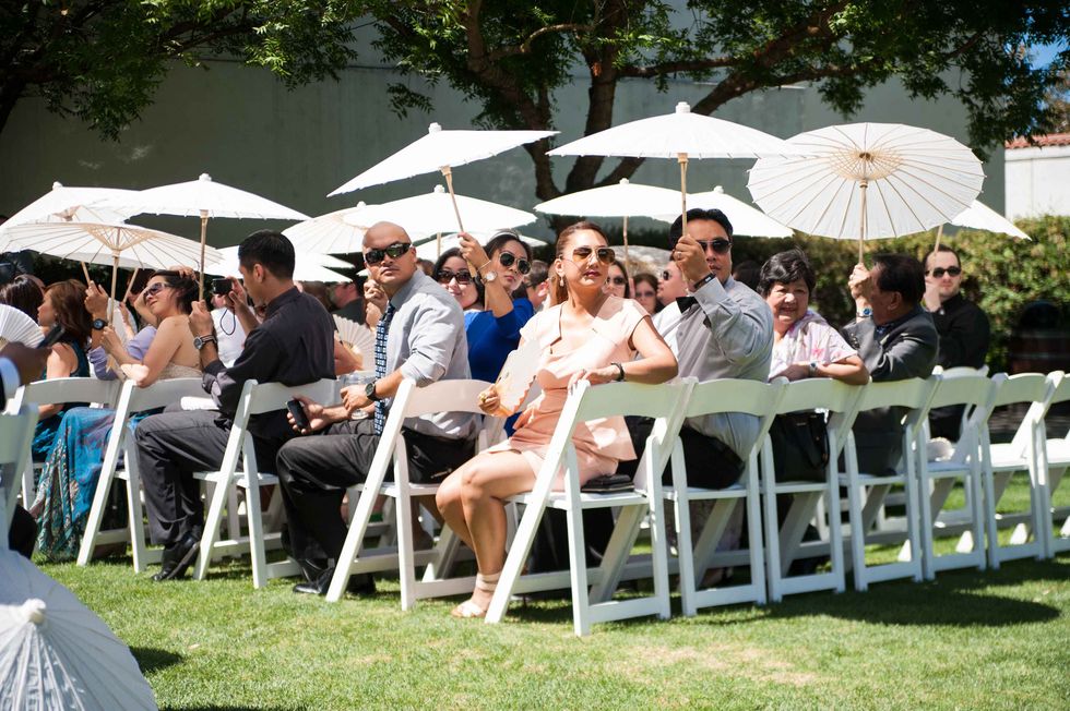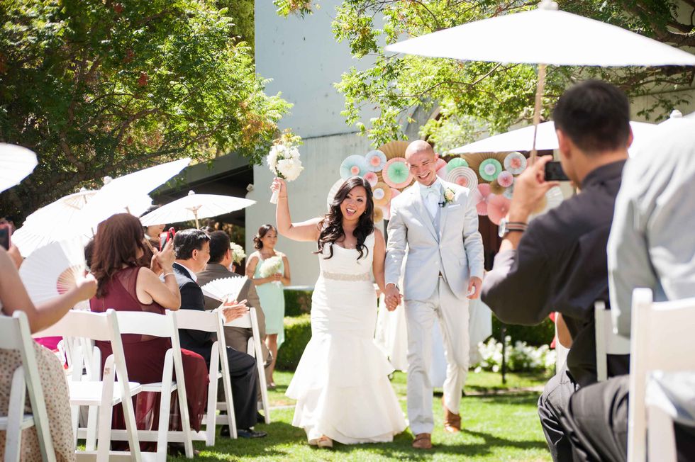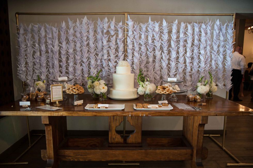 In honor of the groom's Japanese heritage the couple included the 1,000-crane tradition, displaying the paper birds behind the cake. Instead of doing it themselves, however, they asked their guests to make the paper cranes, so that each person had a tangible part of the presentation. The result was striking and beautiful. That wasn't the only DIY aspect of their nuptials. The couple made the colorful and fun ceremony arch display, and the bride's mom put together all the flowers including bouquets, centerpieces, and boutonnieres. Jennifer made all the print displays and invitations.