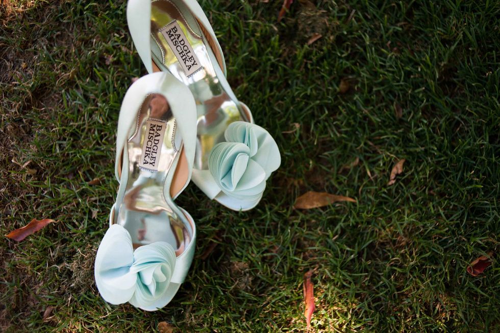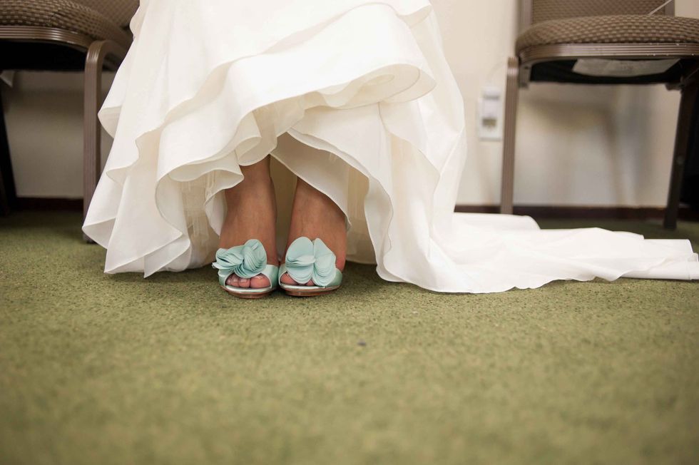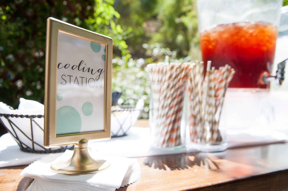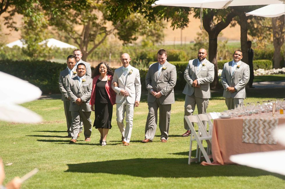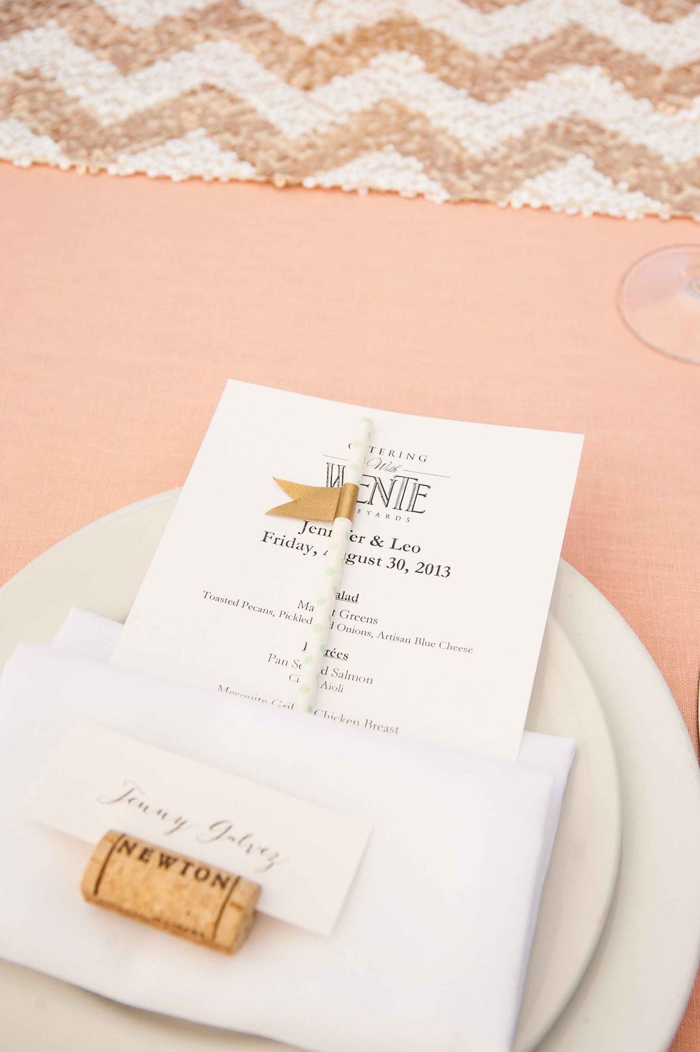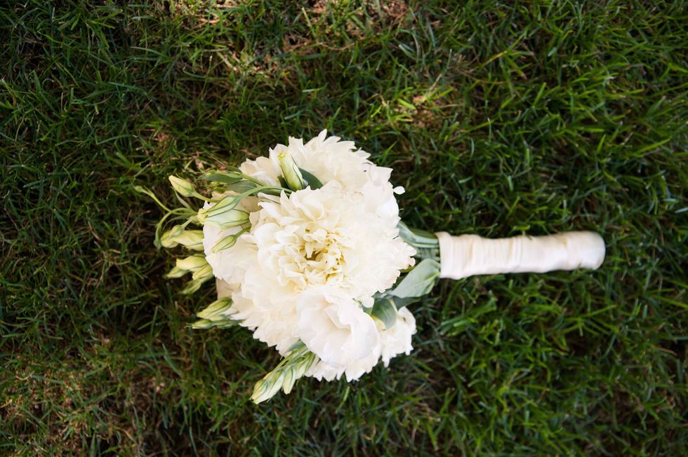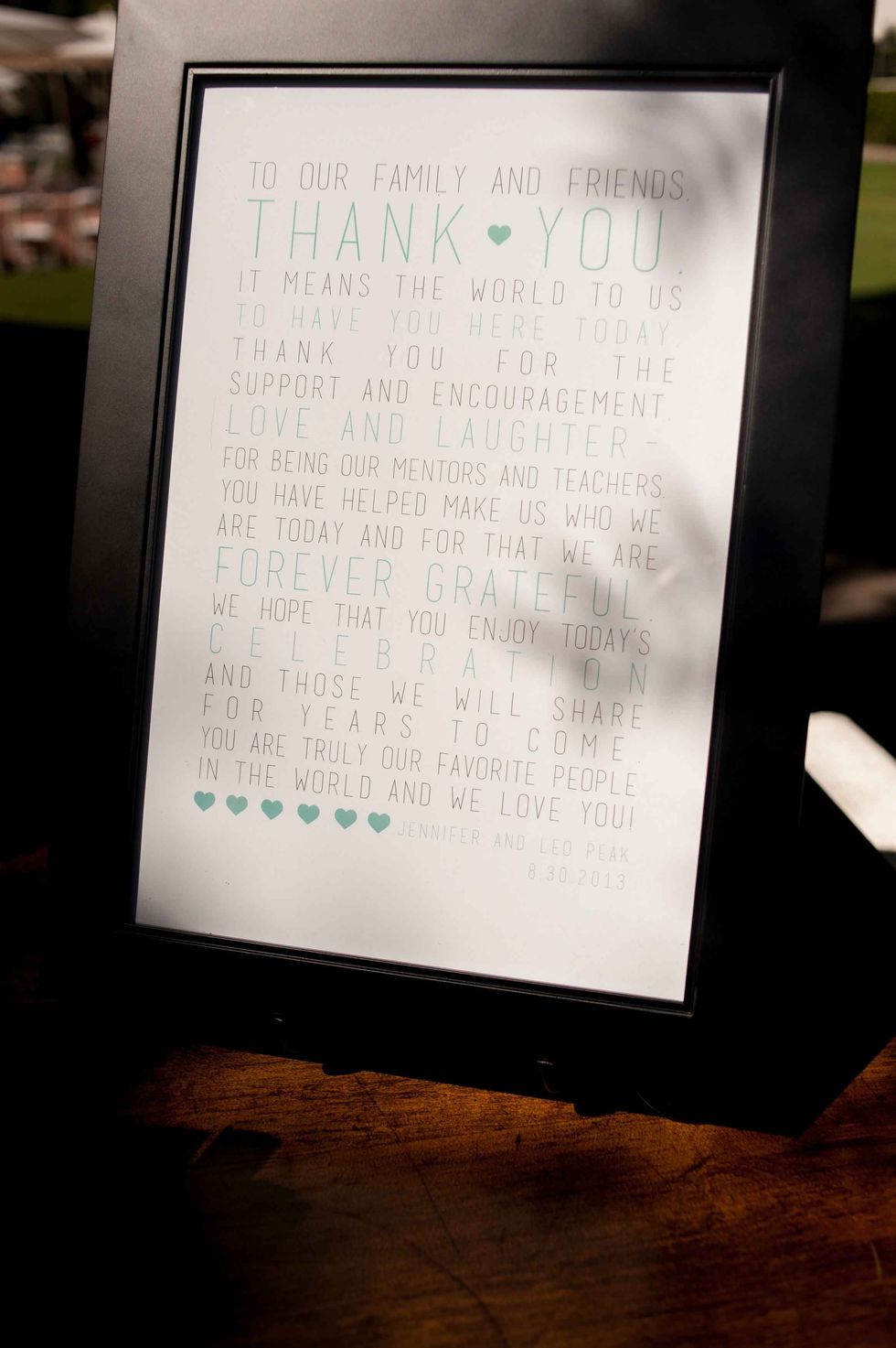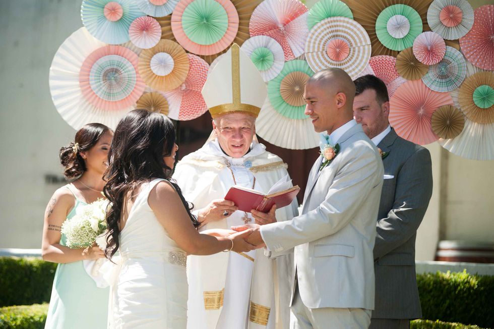 In honor of the groom's Japanese heritage the couple included the 1,000-crane tradition, displaying the paper birds behind the cake. Instead of doing it themselves, however, they asked their guests to make the paper cranes, so that each person had a tangible part of the presentation. The result was striking and beautiful. That wasn't the only DIY aspect of their nuptials. The couple made the colorful and fun ceremony arch display, and the bride's mom put together all the flowers including bouquets, centerpieces, and boutonnieres. Jennifer made all the print displays and invitations.