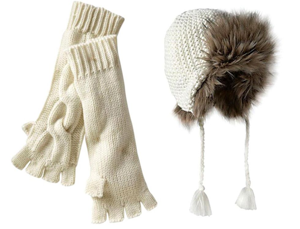 Suit up for the cold, damp winter with Gap’s faux-fur trim trapper and cableknit fingerless gloves. Whether you’re hitting the mountain lodge or braving slick city sidewalks, your fingers will remain free to grasp that steaming hot chocolate.