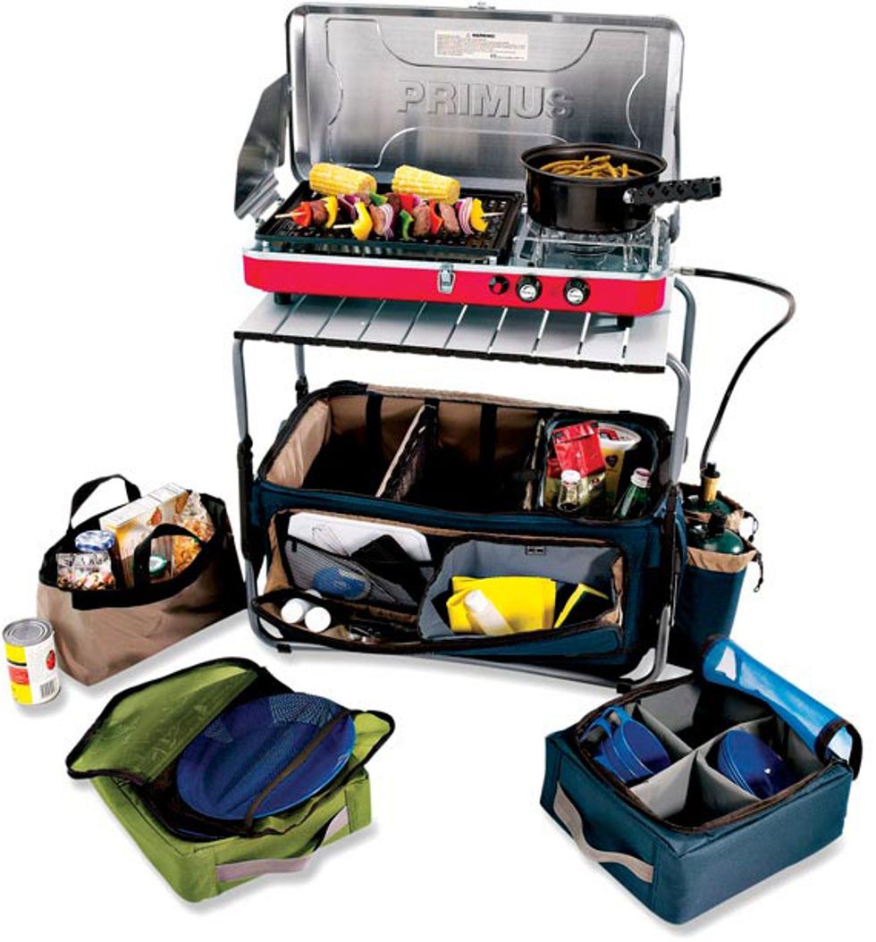 Finally, the solution for the OCD camper—REI’s camp mini kitchen is a compact carrying case with enough compartments to keep even the most organized packer sane. A collapsible aluminum tabletop folds up nicely into the front pocket, a metal frame expands out to form a solid work surface, a two-burner stove tucks away underneath the case, and there are storage pouches galore (including several specifically for wet and dirty cookware).