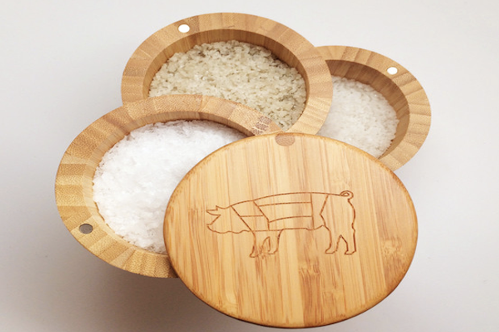 Featuring salts sourced from France and England, this three-tiered salt container comes to you from the mind of Michelin-starred Chef Thomas Keller. Best of all, it comes adorned with an engraved pig. Perfect for that salty (groan) person in your life. // "In A Pinch" Ad Hoc Salt Cellar, $49, finessethestore.com