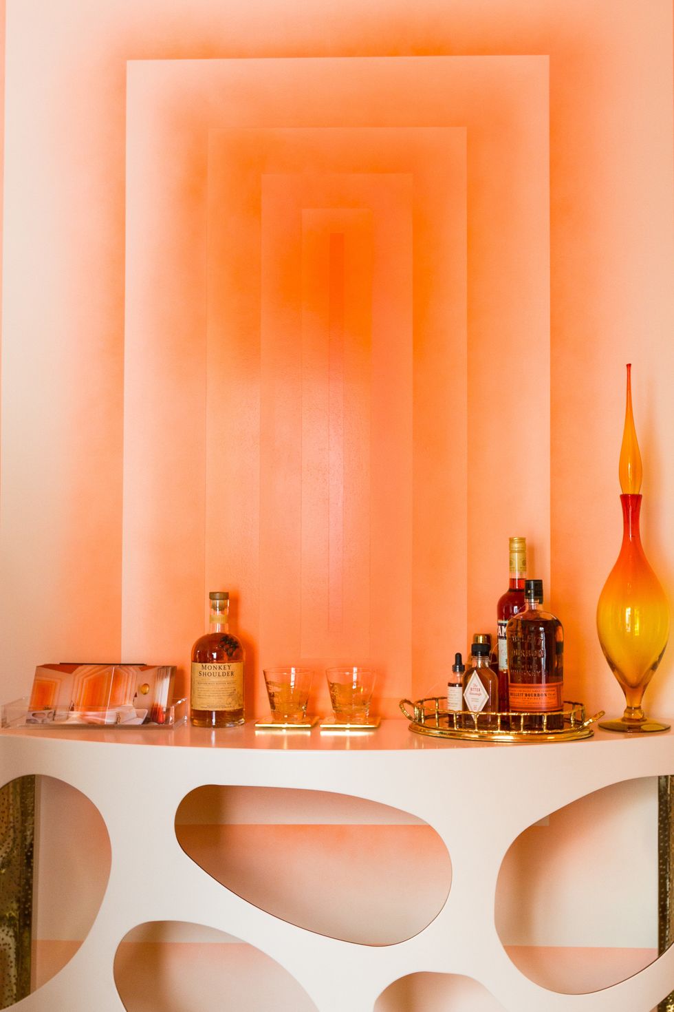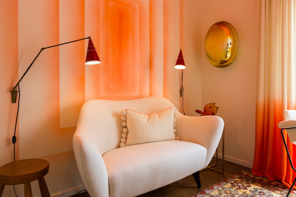 A retro reverie takes place in Tangerine dream by Willem Racké Studio and Susan Chastain, with fabulous mid-century modern furniture, ombre patterns in the curtains, and wall art from Dolby Chadwick Gallery.
