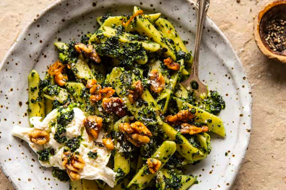 Learn to make this hearty kale pesto pasta and more by picking up the new cookbook from Half Baked Harvest today.