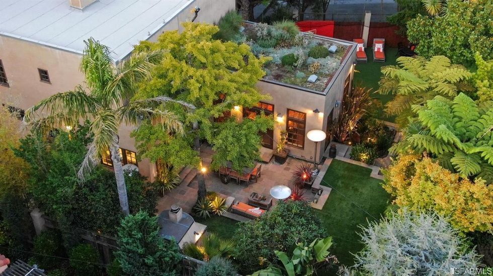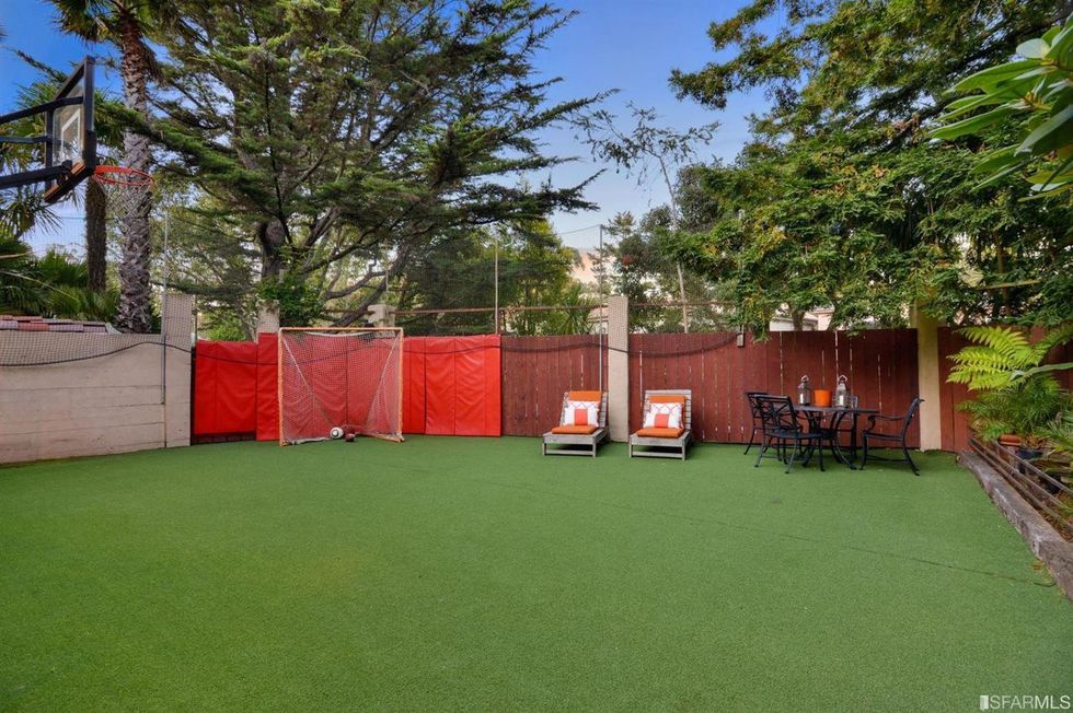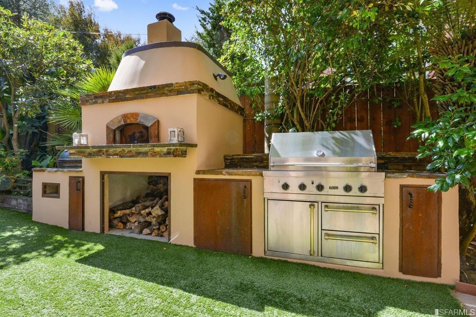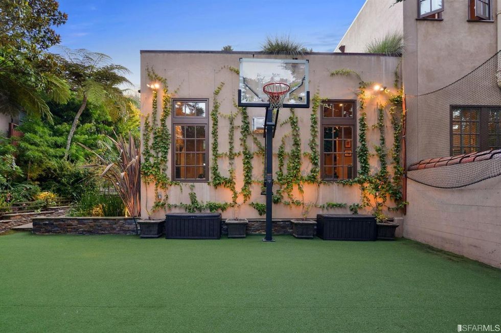 The verdant grounds include an epic outdoor kitchen, so when it comes time for alfresco dining, there's a Viking barbecue grill, a pizza oven, and even a Green Egg smoker. There's also a cozy recessed patio and a turfed basketball court, sound system, and custom lighting.
