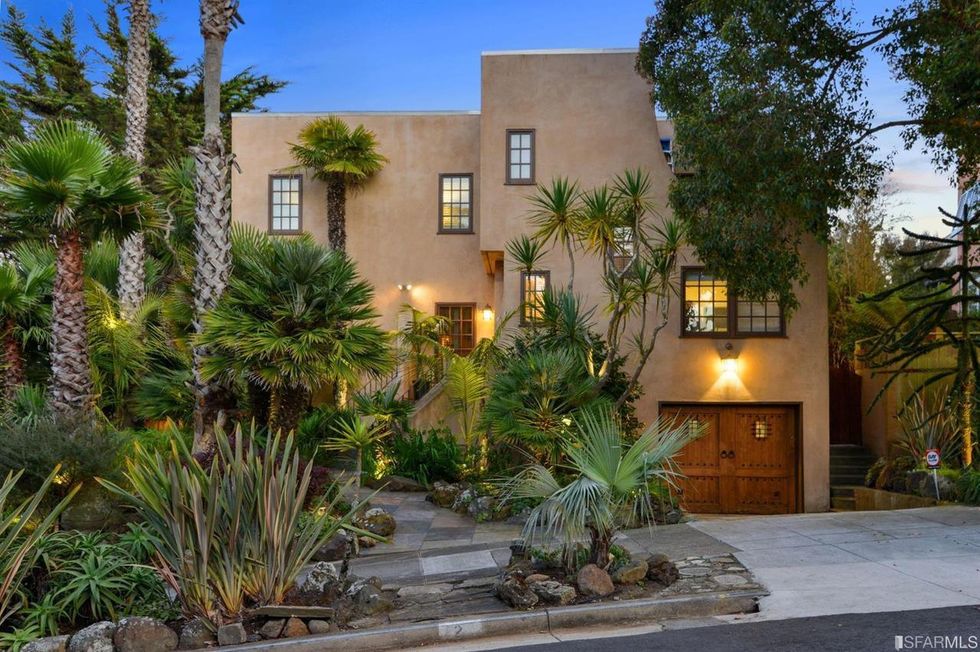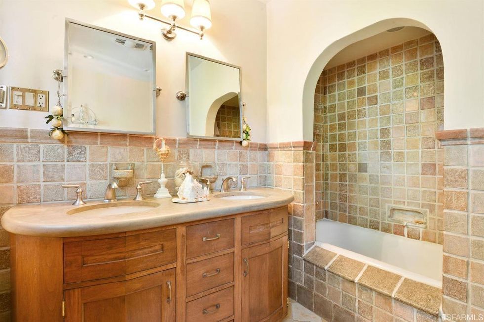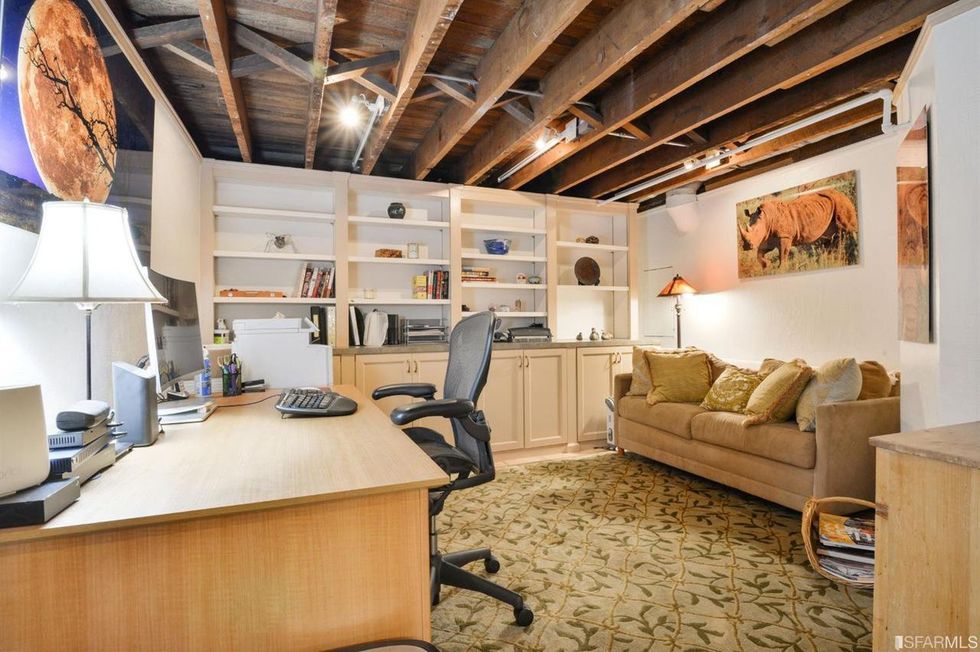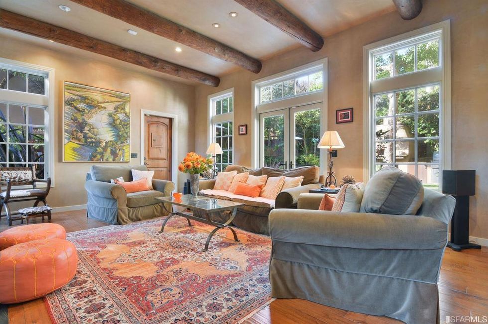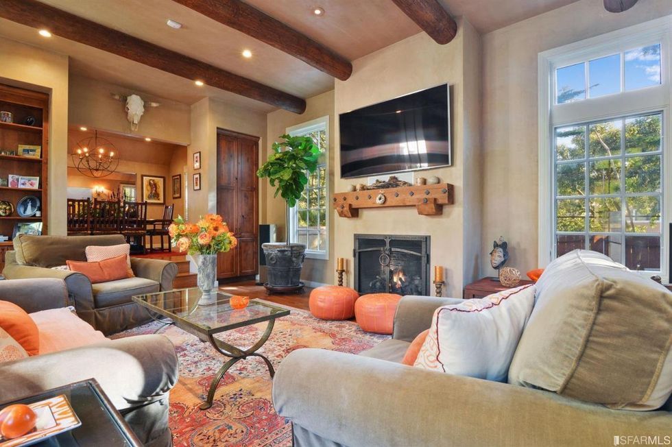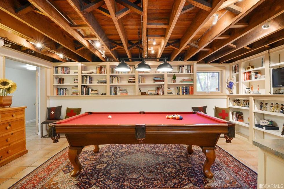 The top level consists of three sizable bedrooms and two remodeled bathrooms. Notable design elements include a rounded arch framing a soaking tub, and marble accents. Downstairs, rustic open beam ceilings hang above the billiards room; there is also a second living room and an office with floor-to-ceiling built-in shelving and cabinets.