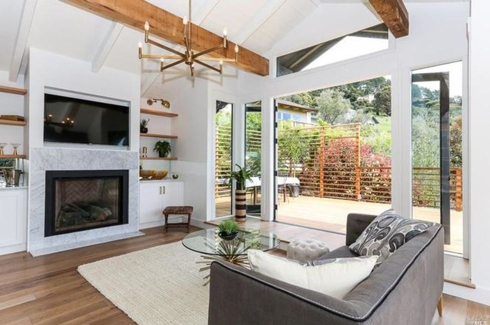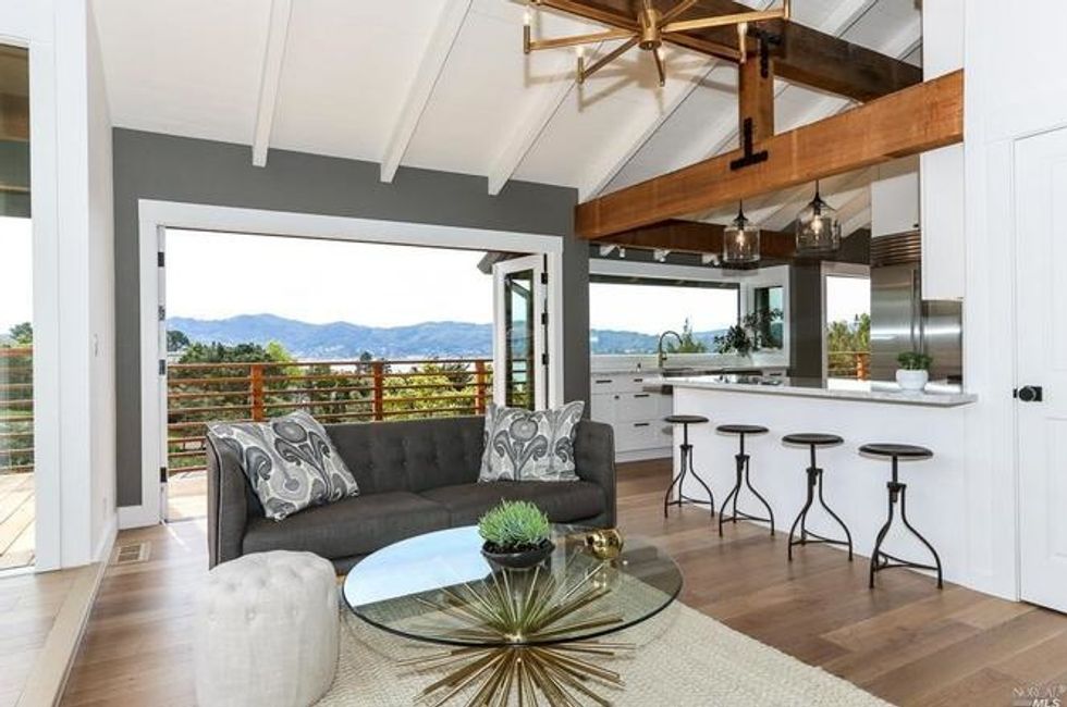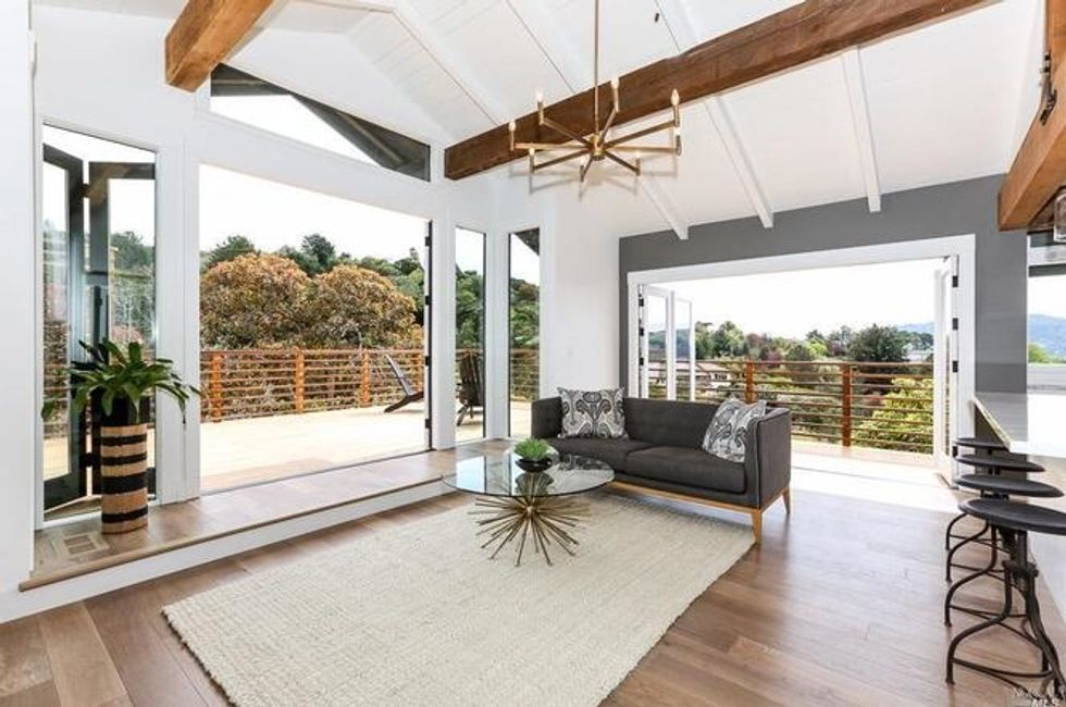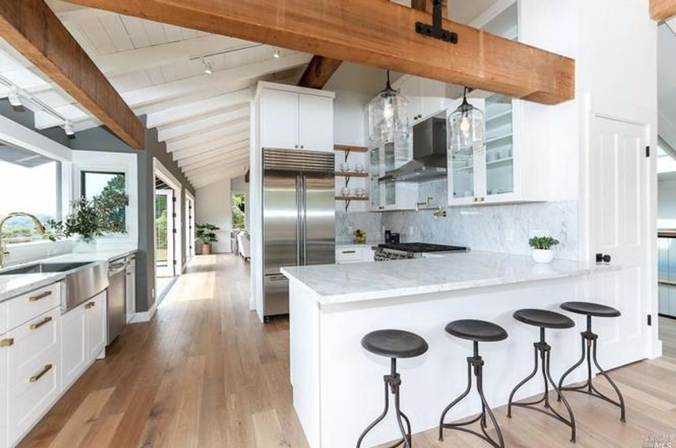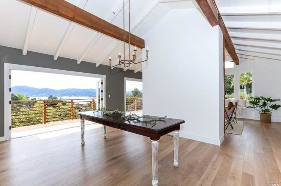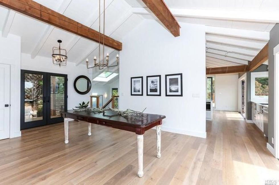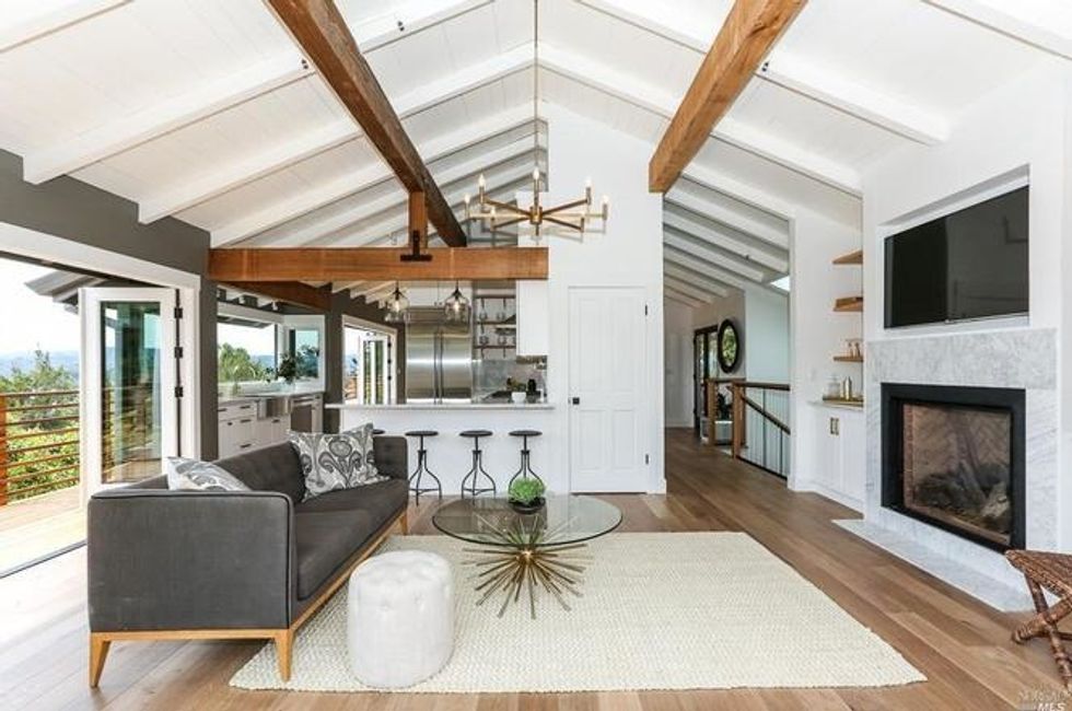 But the house still maintains a sense of coziness for full-time living thanks to hardwood floors and exposed beams, four bedrooms, two fireplaces, a breakfast bar, and intimate nooks throughout the open floorplan.