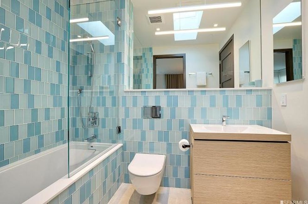 Tile lovers will go gaga for the trappings in the kitchen and baths, where modern shapes and retro hues feel current and cool. Wood and marble floors throughout provide warmth and contrast in a home that is minimalist yet cozy with plenty of pattern play.