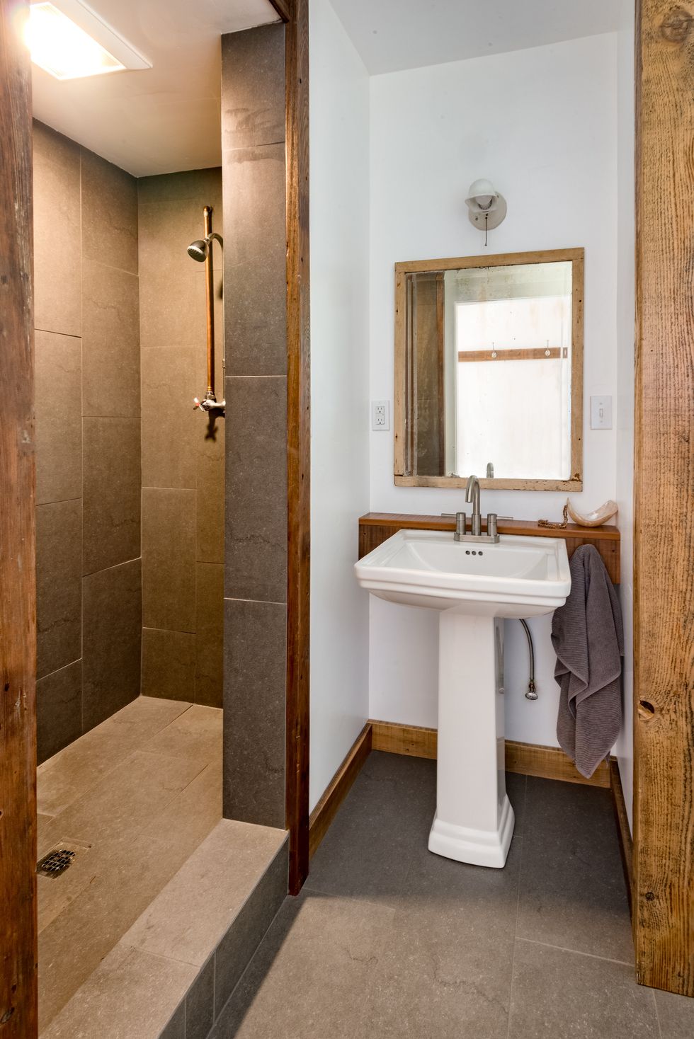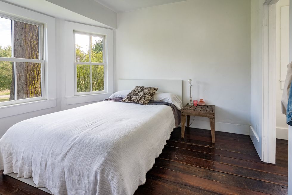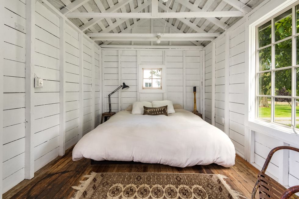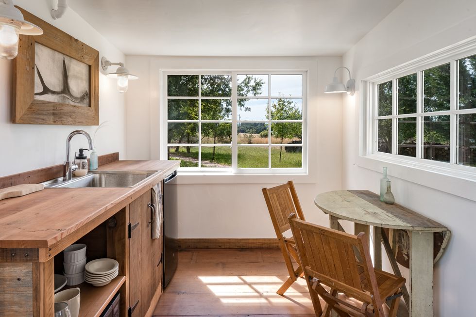 The north-facing kitchen has a large island and porcelain trough sink. Behind are matching floating wood shelves for a picture-perfect display of tableware. A small sitting area to the right of the double doors offers a joint entry area to hang coats and boots, or sitting nook to cozy up with a book on the sofa. Upstairs an enormous bedroom awaits bathed in natural light from windows all around. Another small room on this level makes for another place to sleep, or a home office.