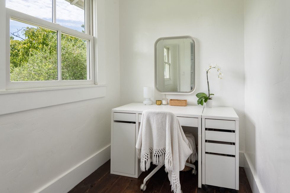 Four points of entry open into the main house for easy indoor/outdoor living: The front door leads to an airy living room with the fireplace and bedroom to the left. Just beyond is a central space with two French doors opening up to a small deck with steps down to the grounds. Across the way is a bathroom with a standalone soaking tub and a staircase alongside. In the back of the house is another set of doors from a large deck overlooking the sweeping walnut tree and a swing in the yard.