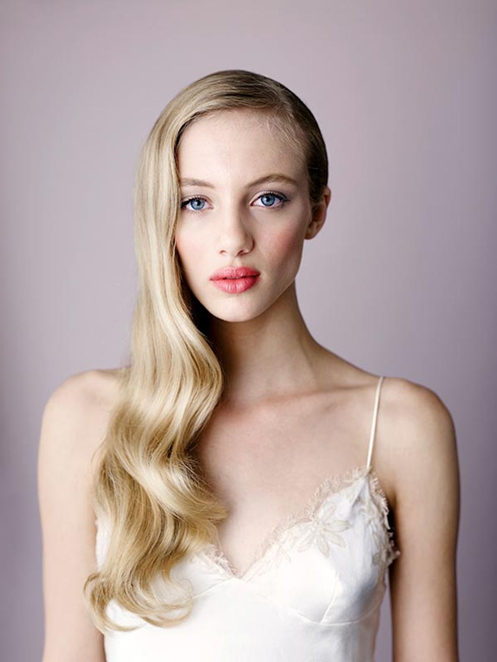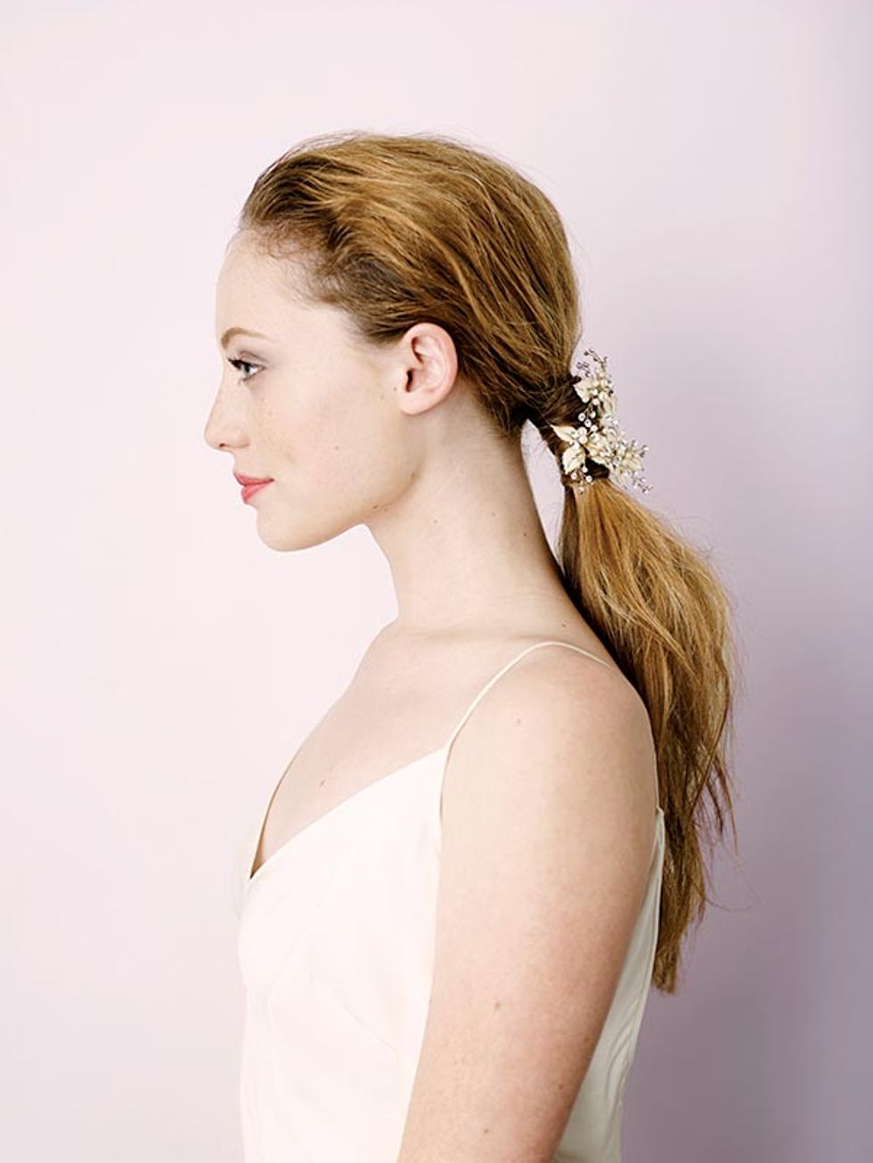 Ponytails trotted down Jenny Packham and Marchesa’s spring runways. “A well-executed ponytail can be really strong, but still soft and effortless,” says Villa. First, apply mousse at the roots and use a diffuser to dry the hair. Next, smooth individual pieces with a flat iron, starting midshaft to keep volume at the roots. Pull hair back into a low ponytail. To ensure the look reads “wedding day” rather than “workout,” Villa wraps a small segment of hair from underneath the ponytail around the elastic to conceal it, securing with a bobby pin.